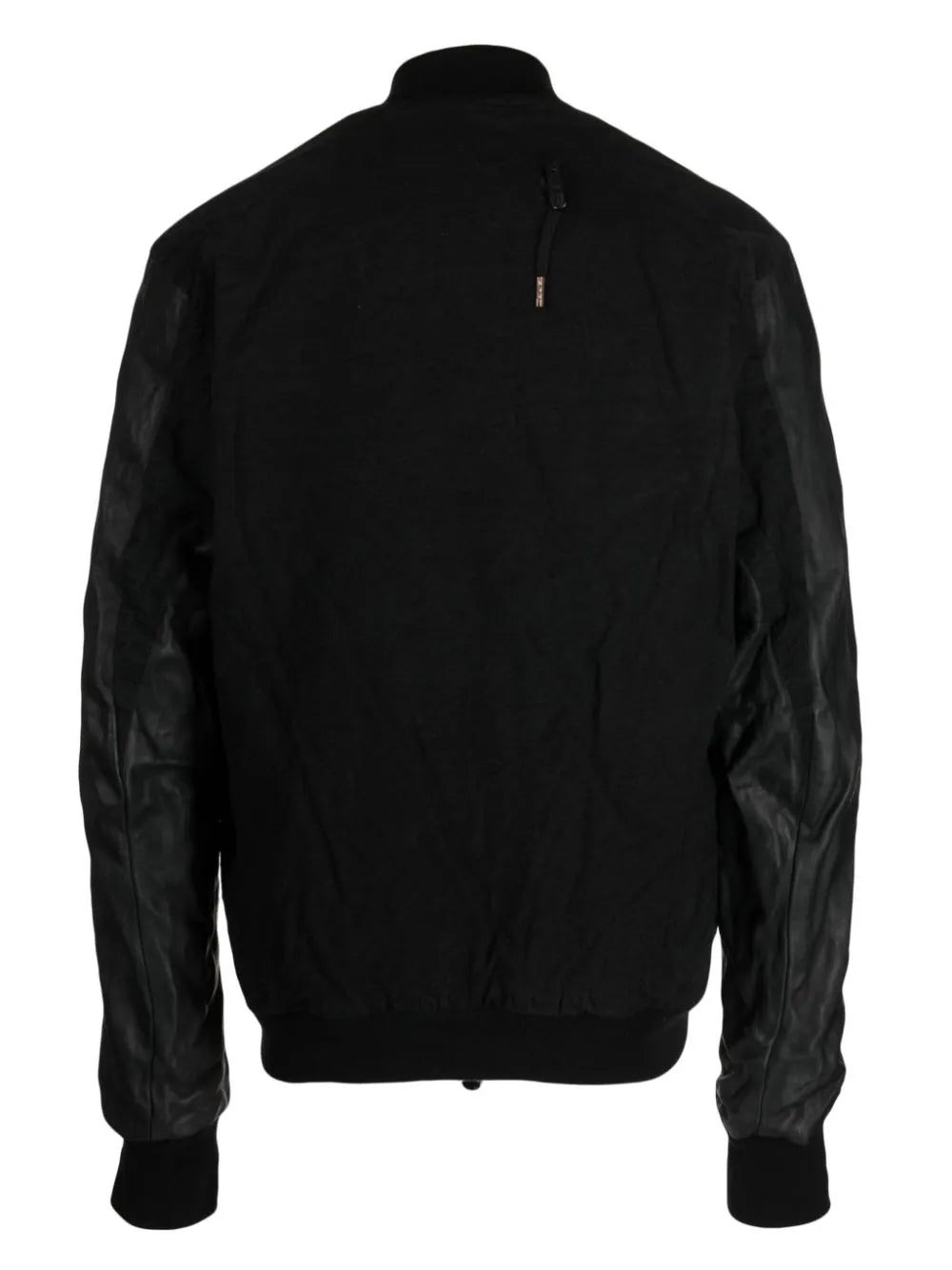 black cotton blend lightweight construction collarless concealed front zip fastening long sleeves two side inset pockets straight hem