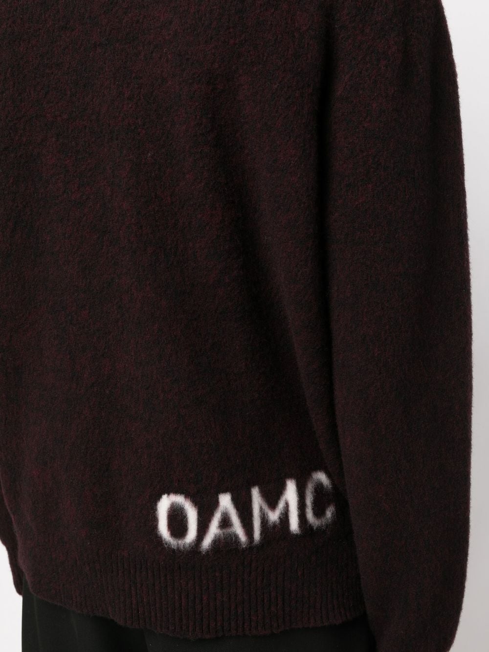 logo-knit roll-neck jumper from OAMC featuring dark purple, stretch-wool, logo print to the rear, roll neck, long sleeves and straight hem.