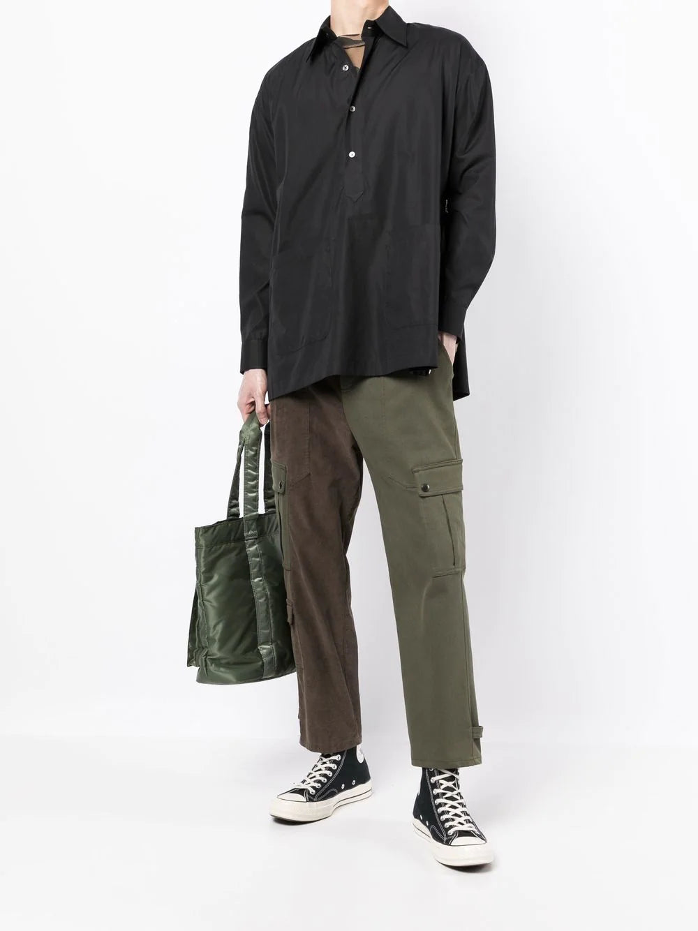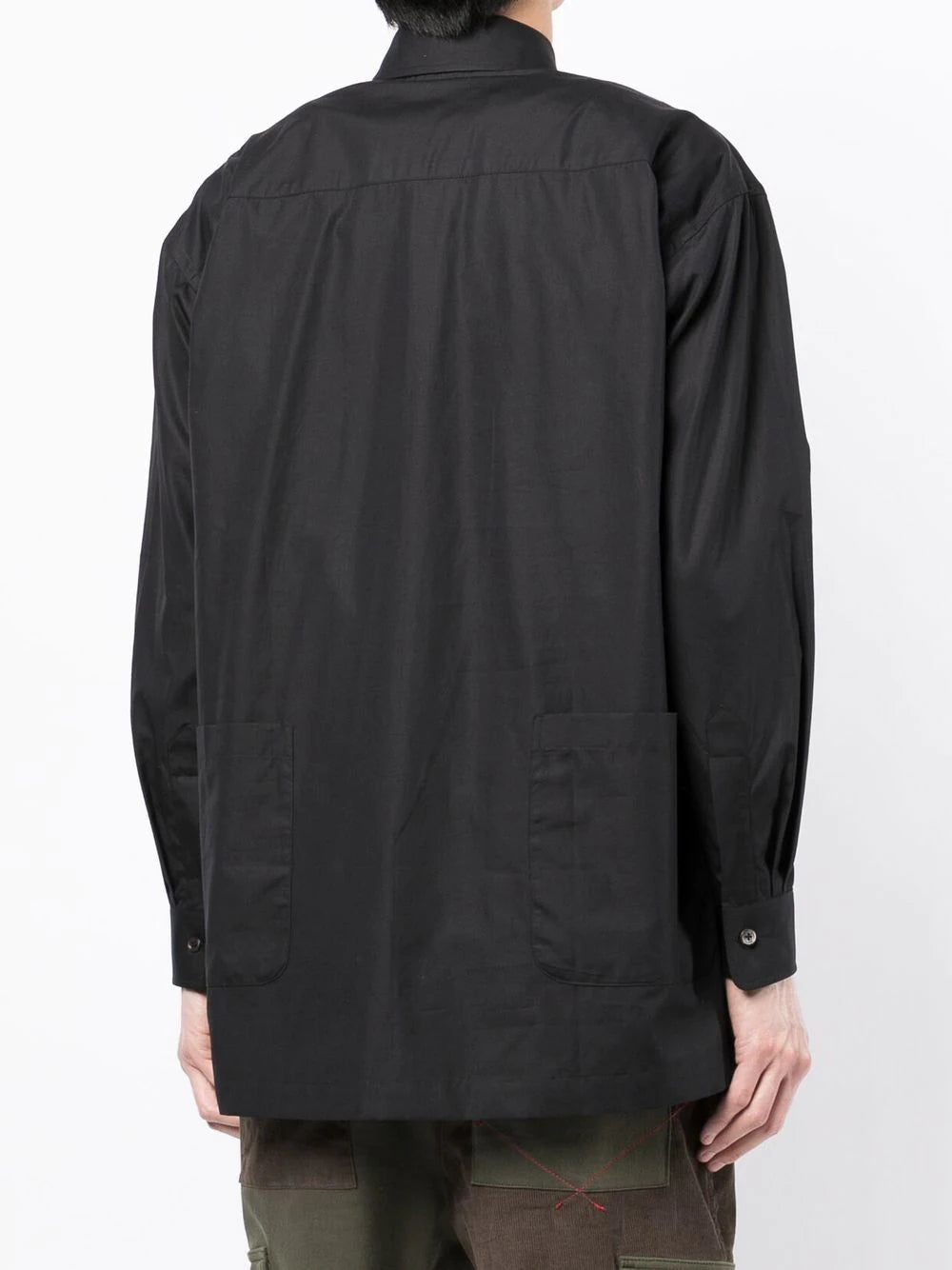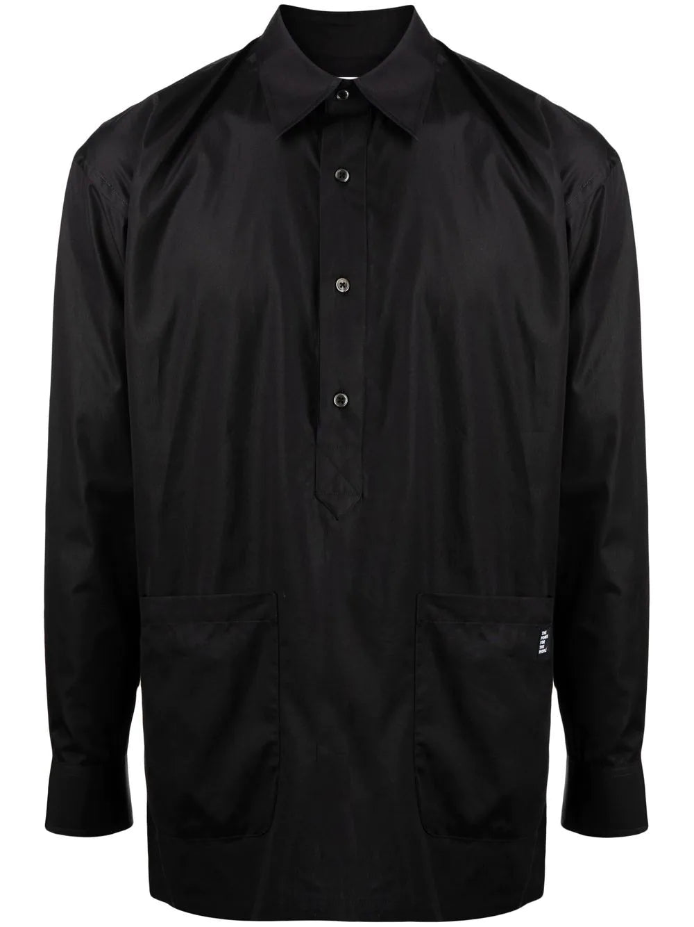 Black cotton logo-patch detail shirt from The Power for the People featuring logo patch to the front, classic collar, front button fastening, long sleeves and straight hem.