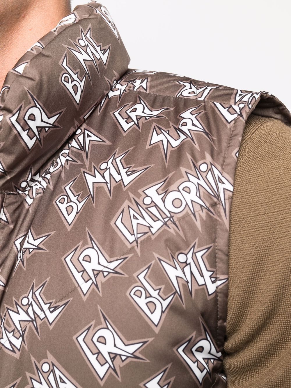 Brown/white down feather logo-print padded gilet from ERL featuring slogan print, all-over logo print, padded design, high neck, front zip fastening, two front welt pockets, sleeveless and straight hem.