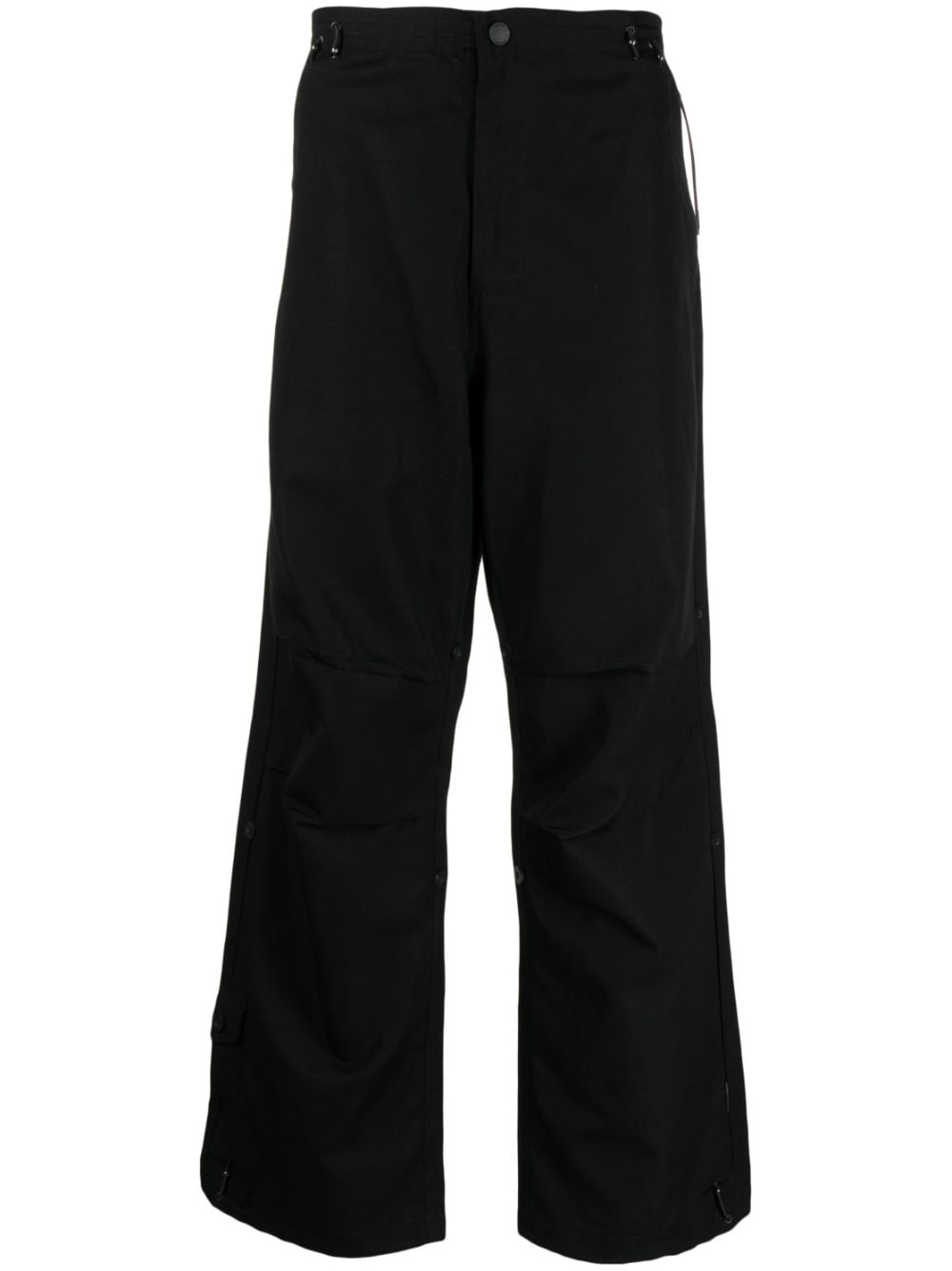 Original lose-fit trousers from MAHARISHI featuring black, cotton-linen blend, dart detailing, front button and zip fastening, elasticated waistband, side button fastening, two side inset pockets, side zip-fastening pocket, side flap pocket, two rear flap pockets, elasticated ankles and straight leg.