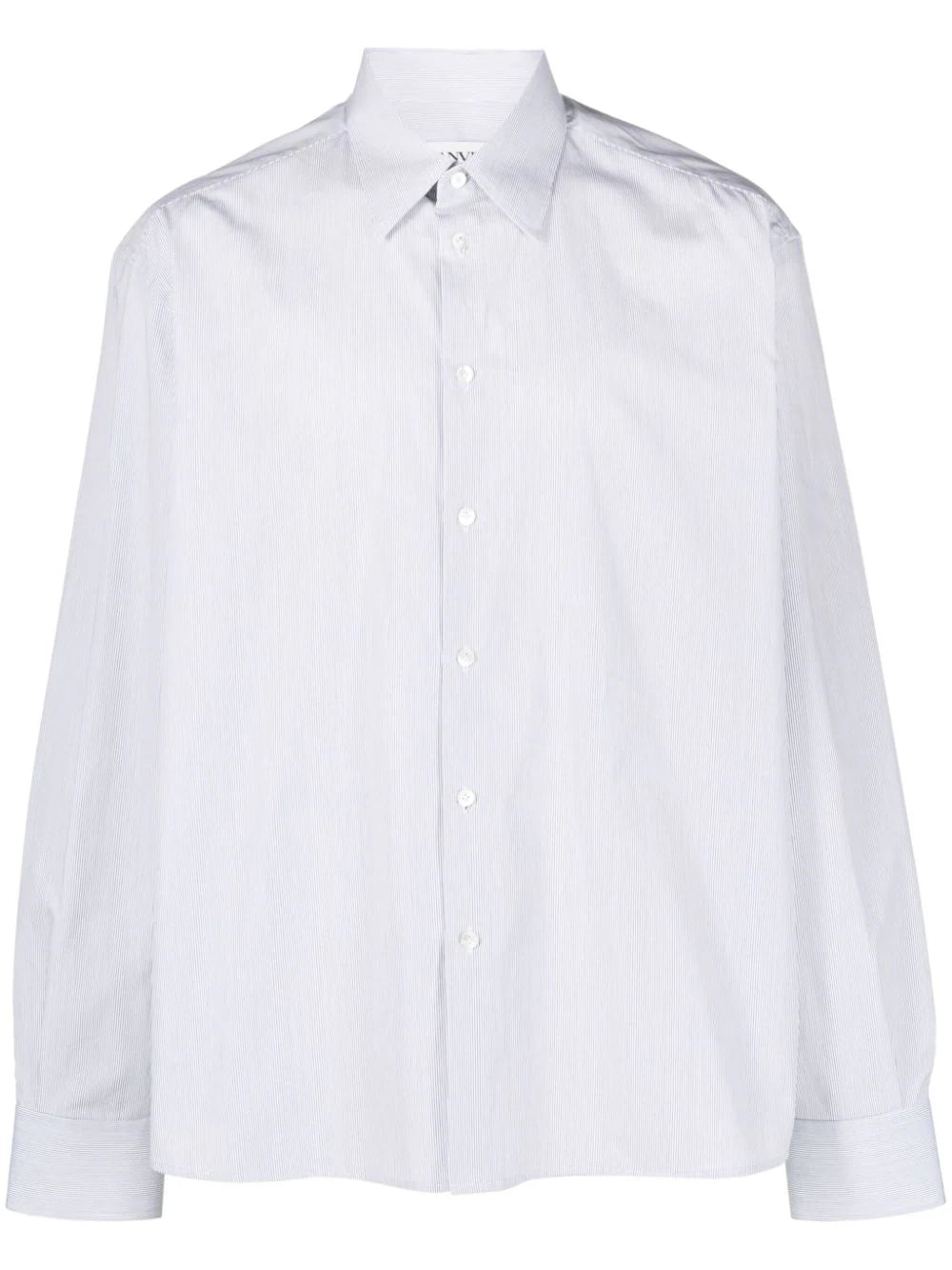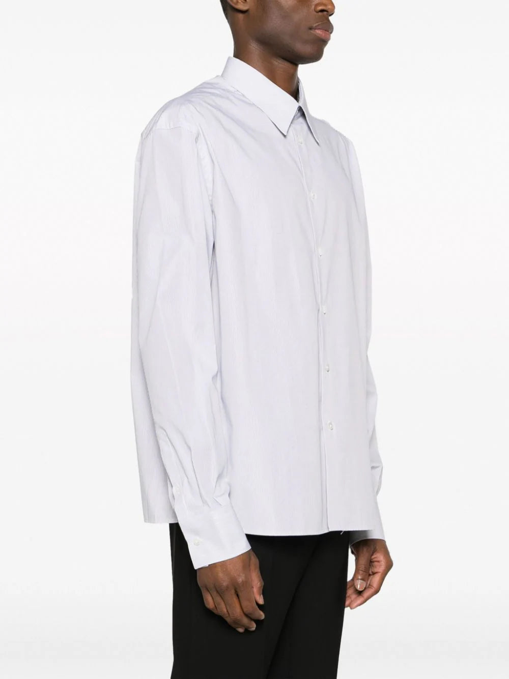 pinstripe-print cotton shirt from Lanvin featuring white, cotton, poplin texture, pinstripe print, classic collar, front button fastening, long sleeves, buttoned cuffs and straight hem.