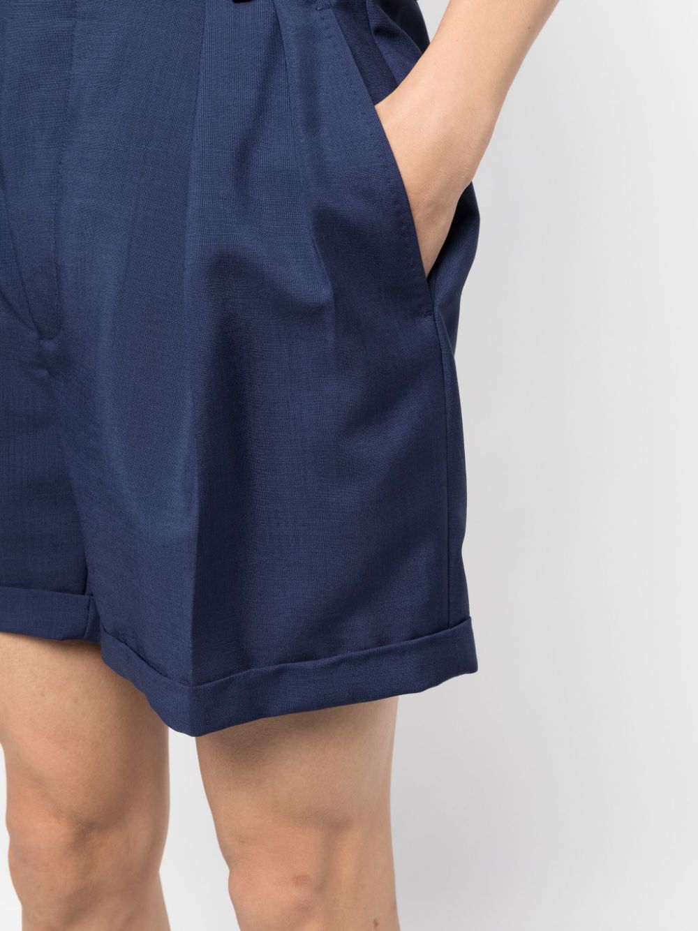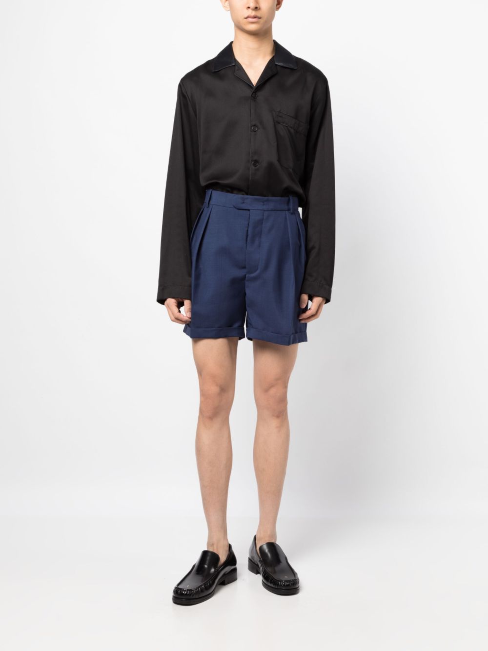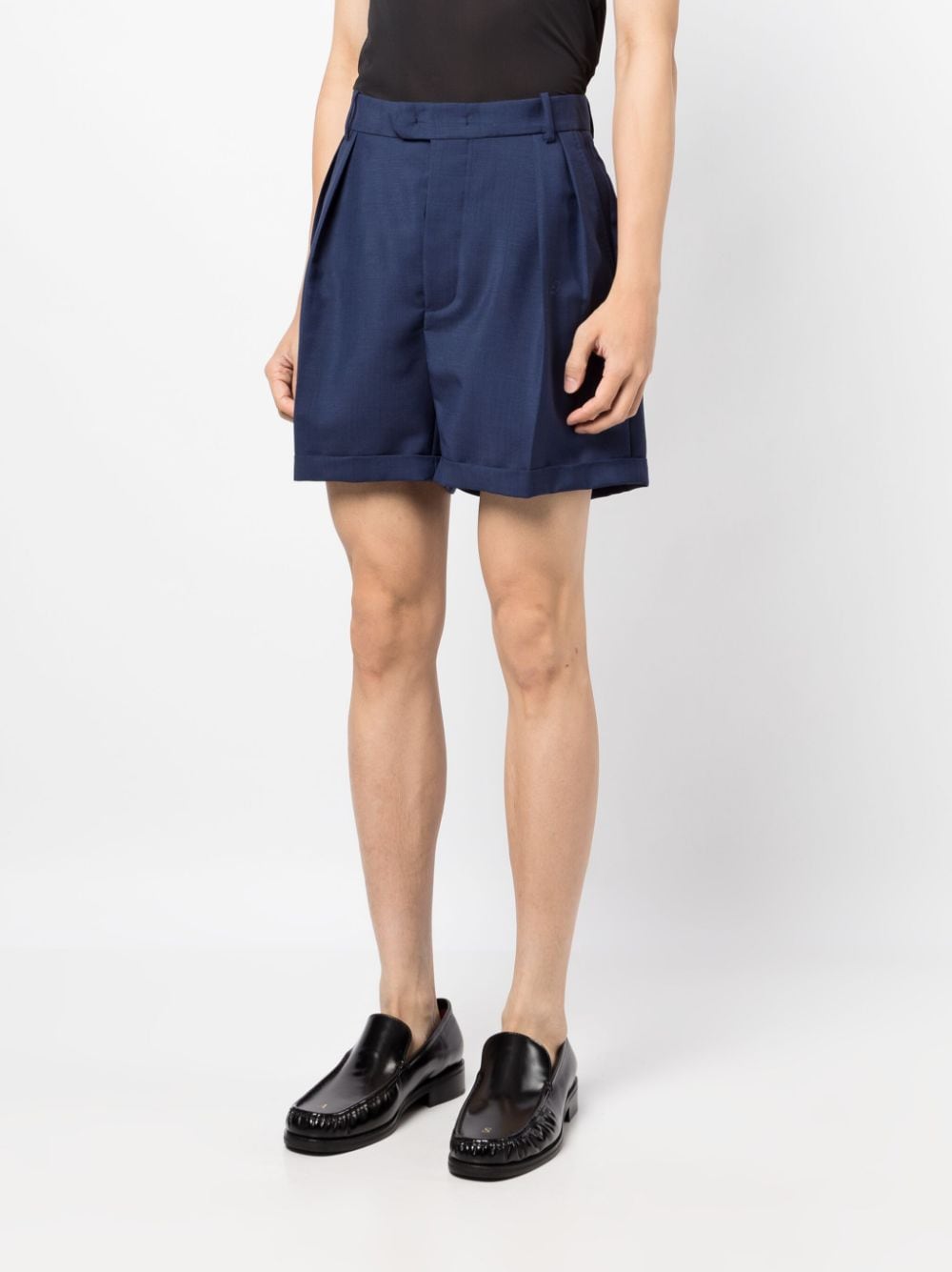 pleated twill tailored shorts from BALLY featuring navy blue, mohair-wool blend, twill weave, tailored design, pleat detailing, belt loops, concealed front button fastening, two side inset pockets, rear button-fastening jetted pocket, turn-up cuffs and thigh-length.