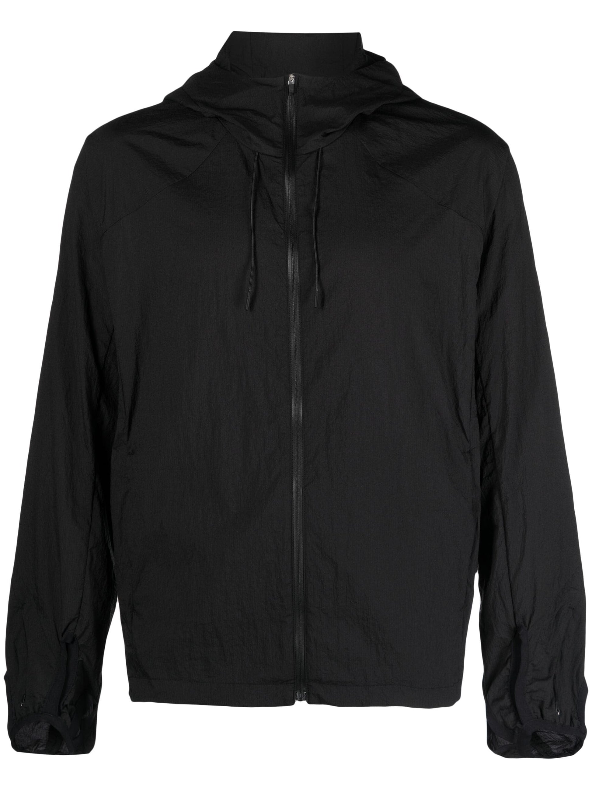 black lightweight ripstop texture water-resistant drawstring hood front zip fastening two side inset pockets elasticated drawstring waistband bonded seams