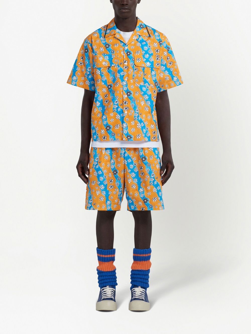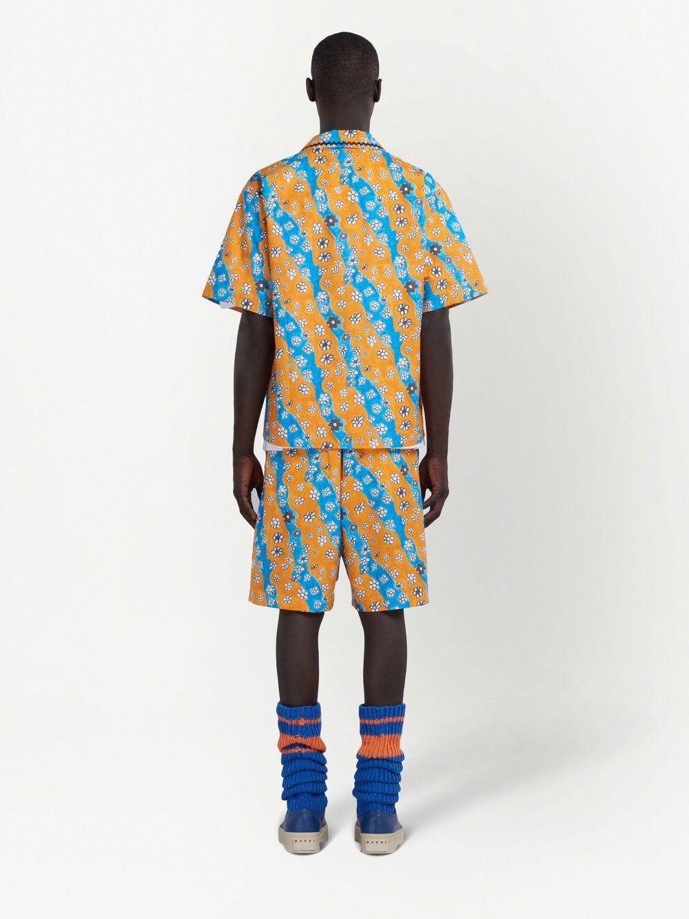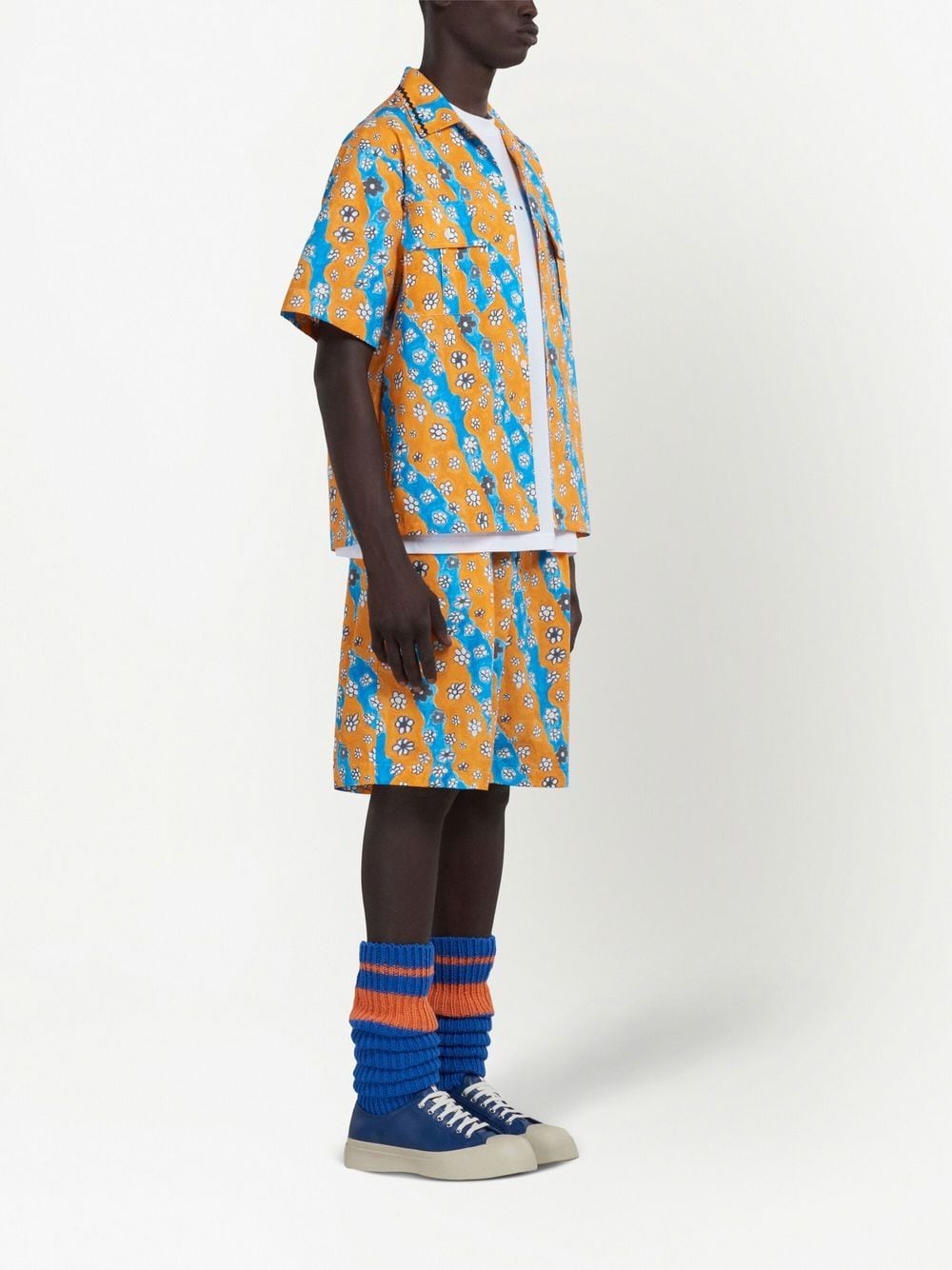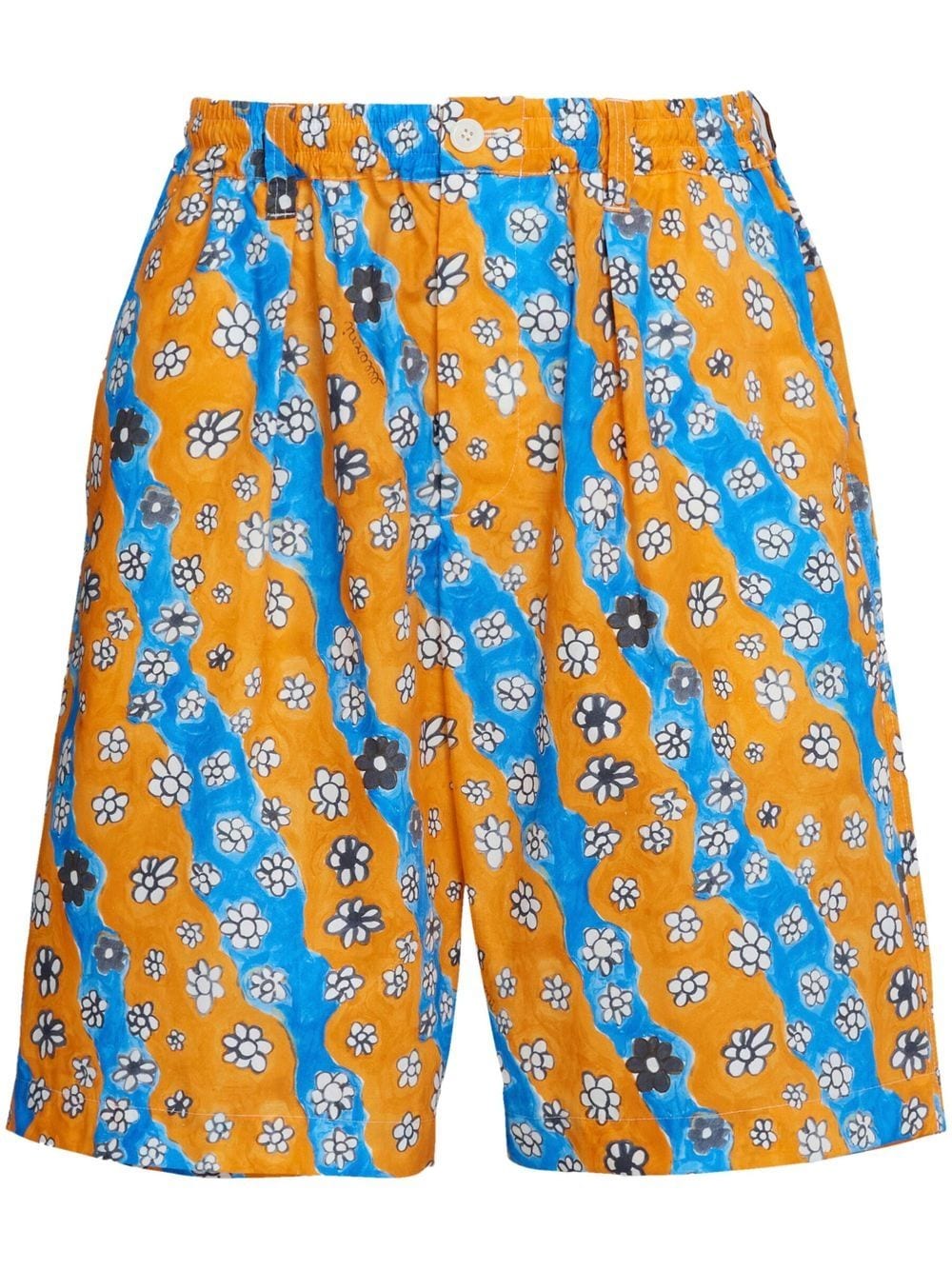 wave daisy-print shorts from MARNI featuring carrot orange, light blue, cotton, wave print, all-over floral print, elasticated waistband, concealed front fastening, two rear welt pockets and wide leg.