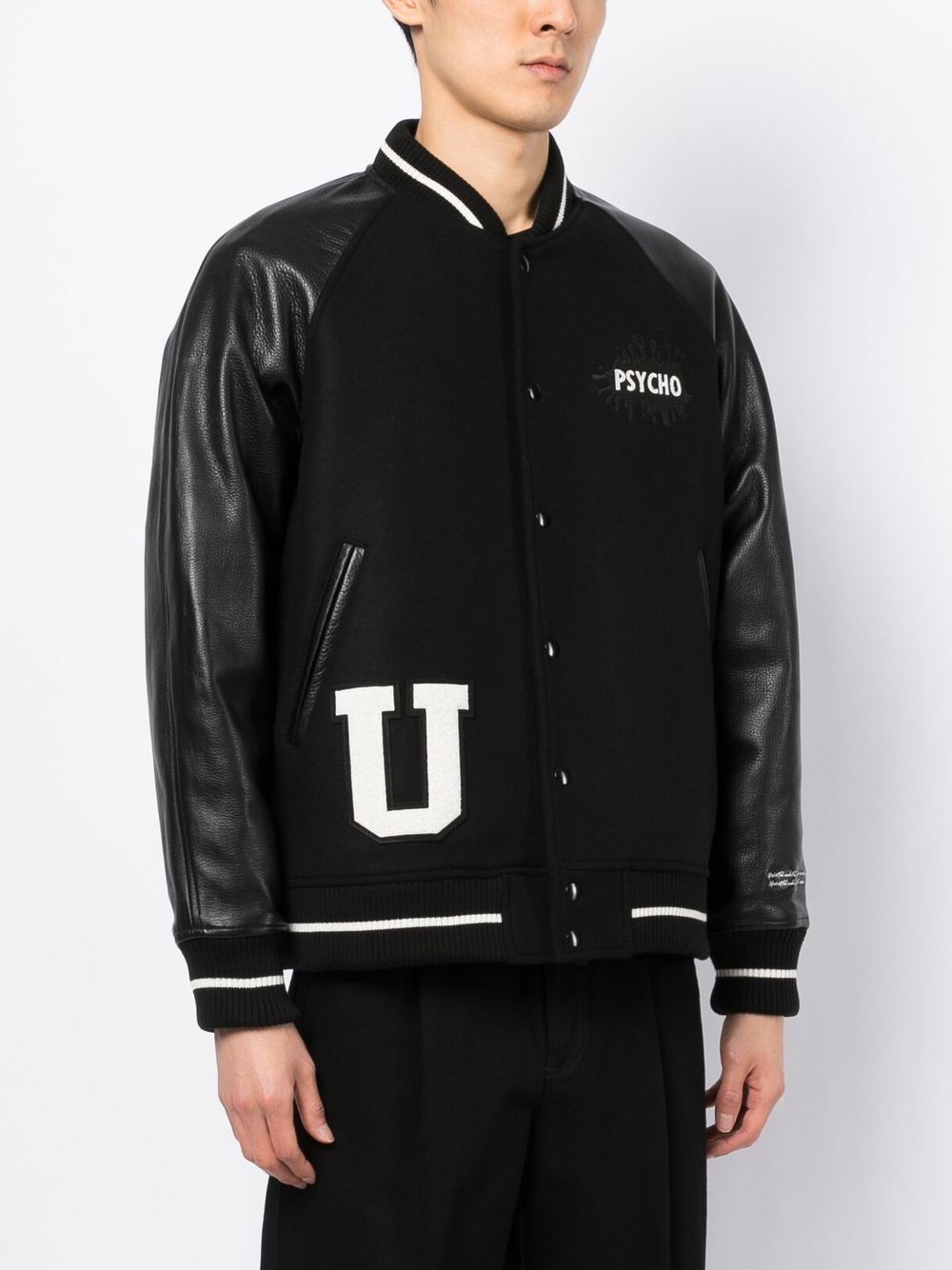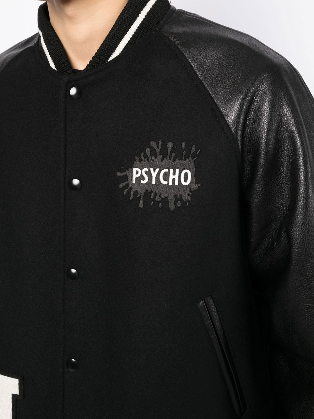 x Psycho patch bomber jacket from Undercover featuring black/white, wool blend, stand-up collar, patchwork detailing, two front welt pockets, press-stud fastening and long sleeves. ©Universal City Studios LLC. ALL Rights Reserved.