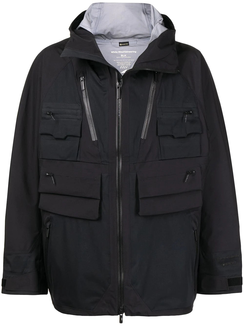 Black hooded zipped jacket from WHITE MOUNTAINEERING featuring classic hood, front zip fastening, long sleeves, two zip-fastening chest pockets, two front flap pockets and two side zip-fastening pockets.