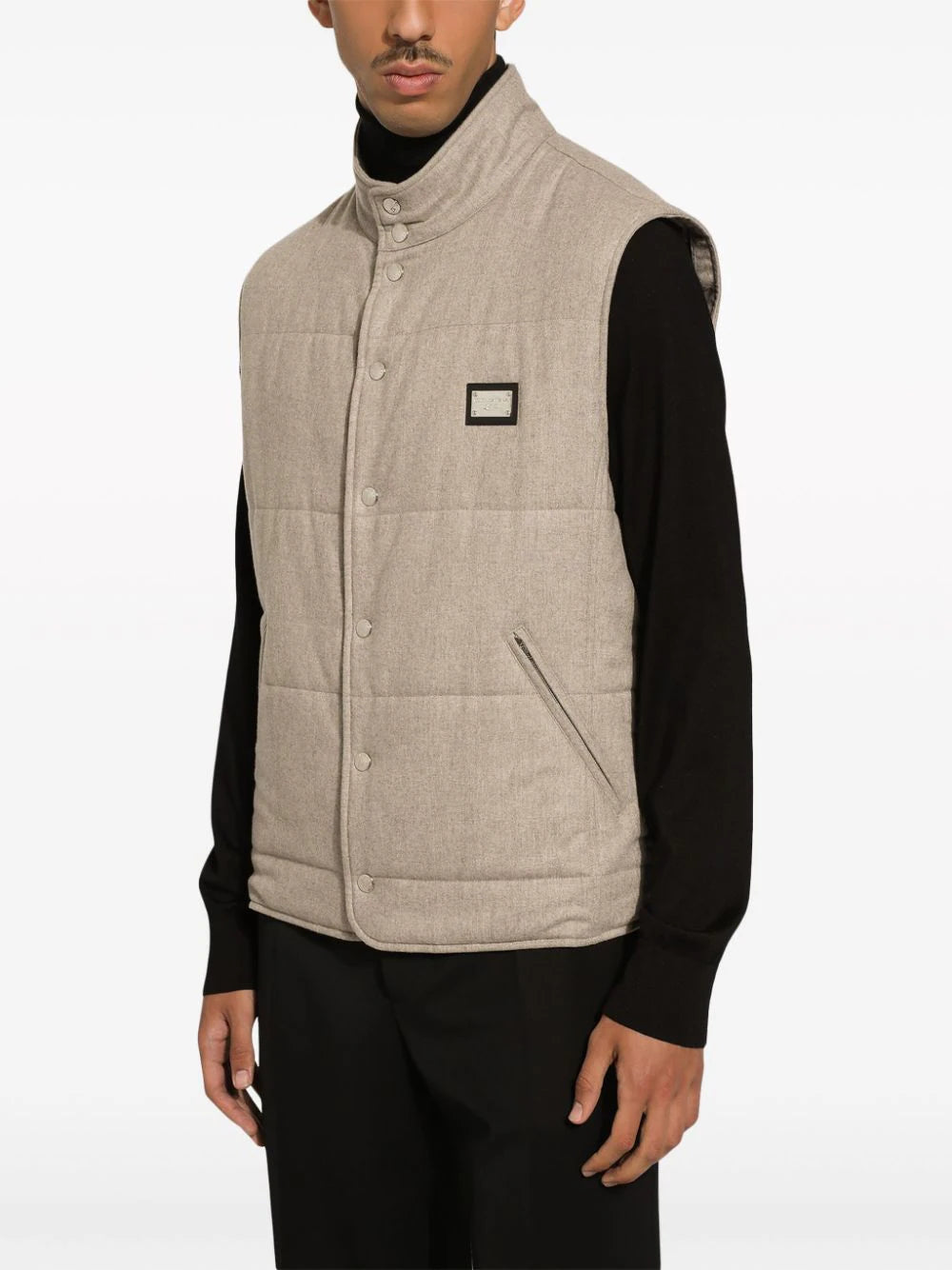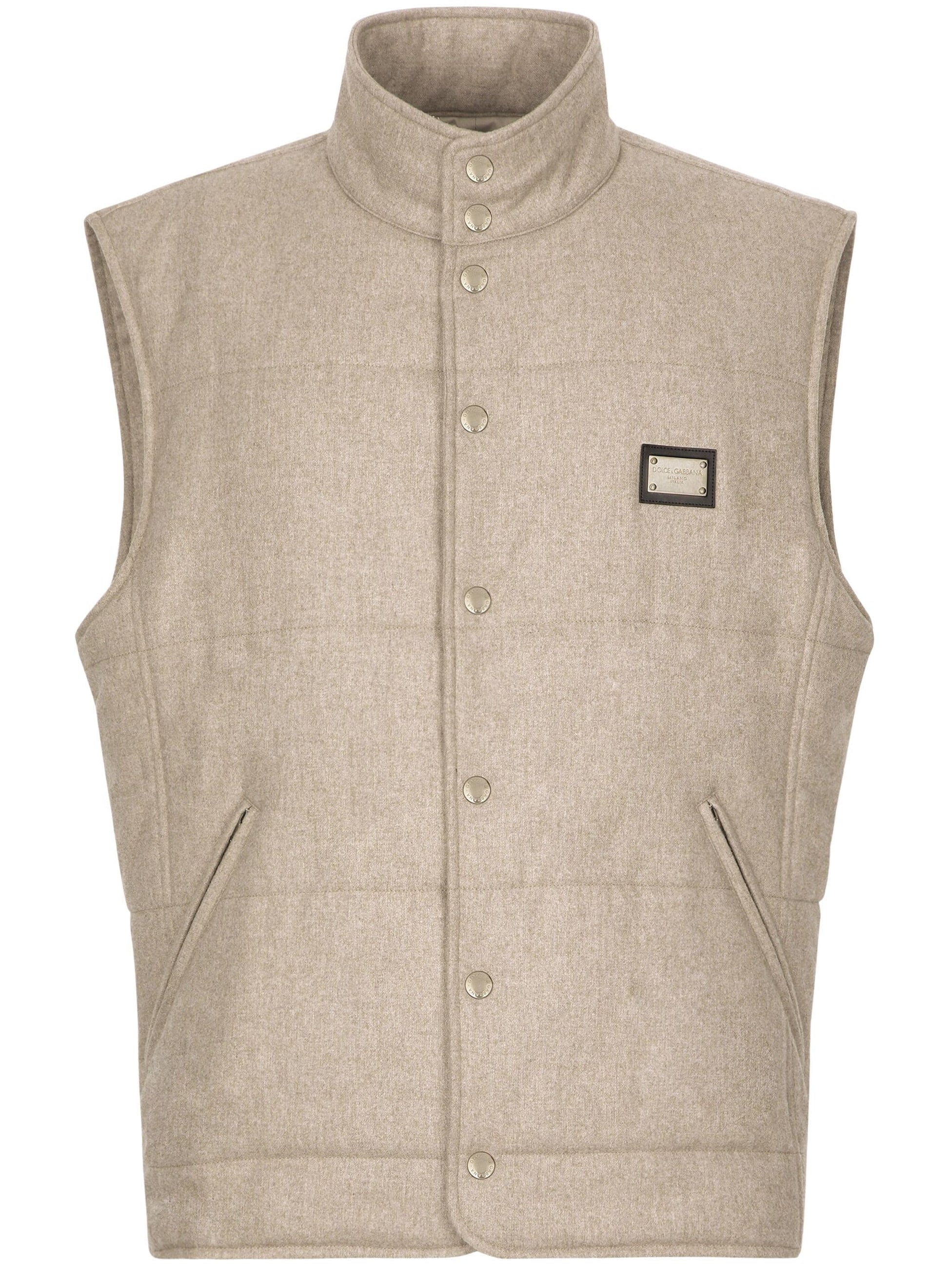 light grey cashmere blend high neck front press-stud fastening logo plaque sleeveless two diagonal pockets to the sides straight hem