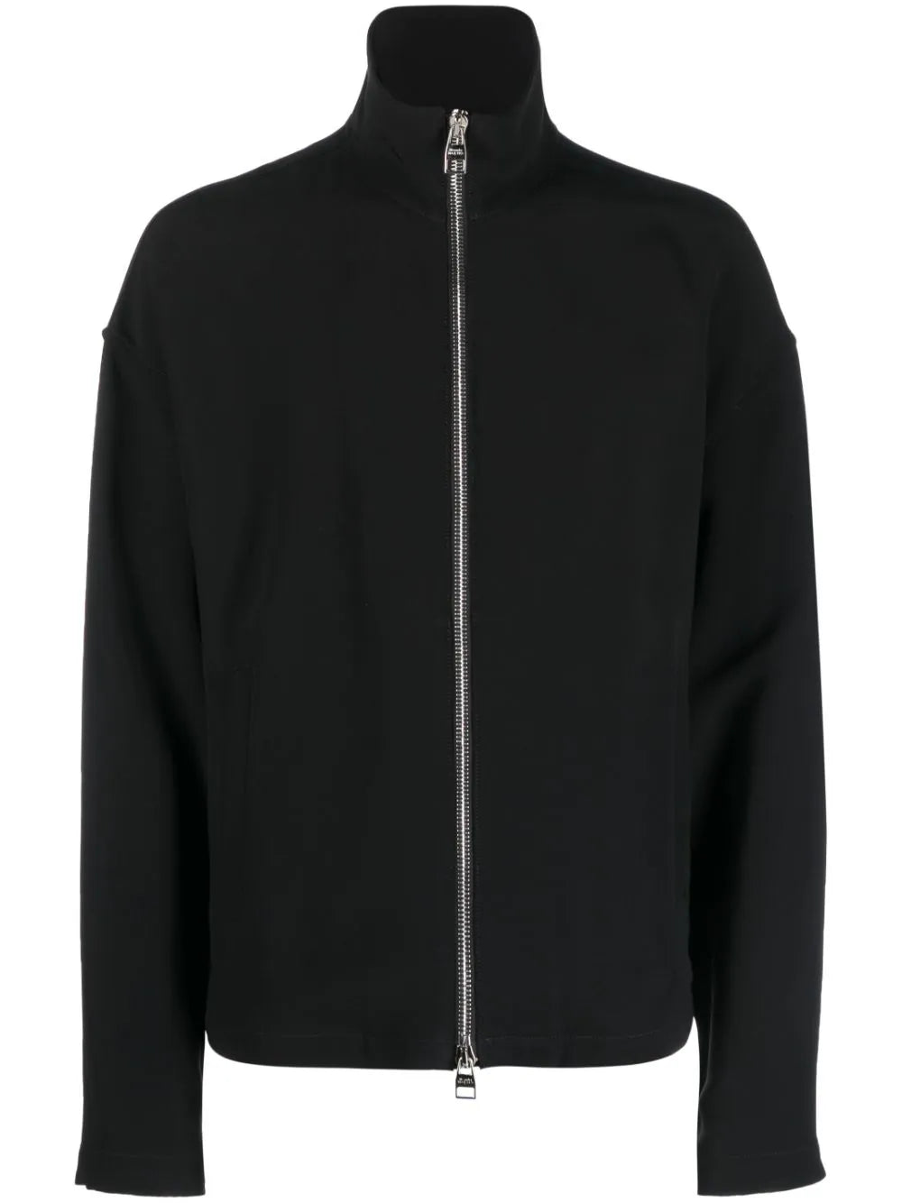 high-neck zipped jacket from Alexander McQueen featuring black, cotton, silver-tone hardware, high neck, front two-way zip fastening, drop shoulder, long sleeves, press-stud fastening cuffs, two front welt pockets and straight hem.
