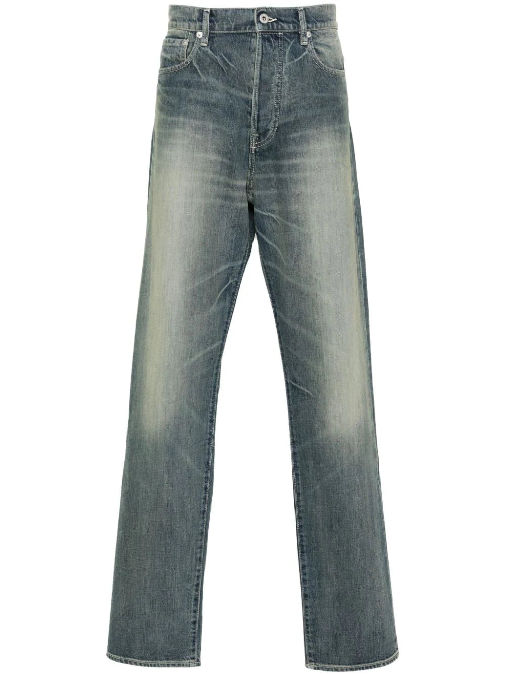 blue cotton denim stonewashed belt loops at the waist classic five pockets embroidered logo to the rear internal logo tag cropped tapered leg front button and zip fastening