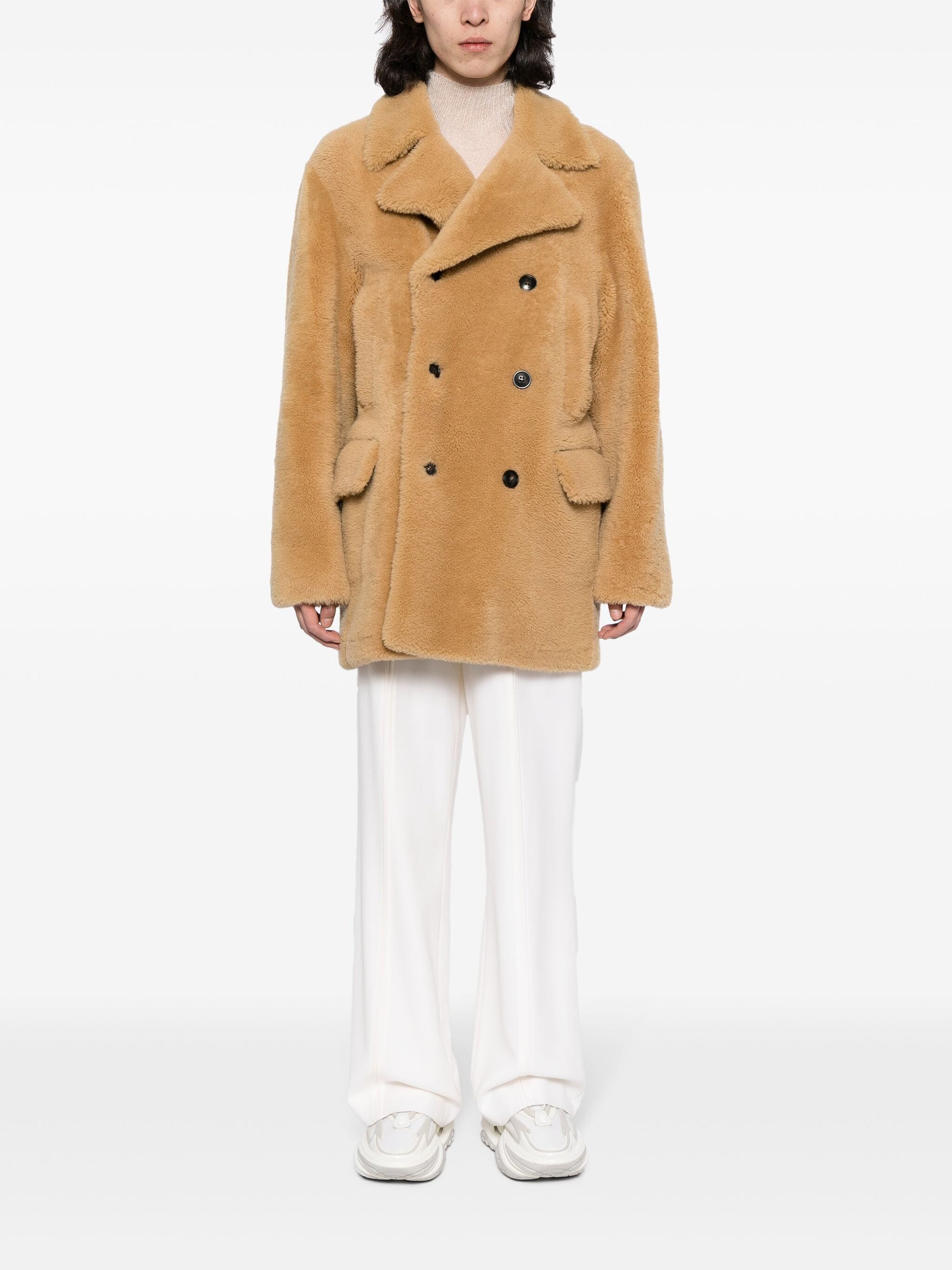 beige leather notched lapels double-breasted button fastening two side welt pockets two side flap pockets long sleeves straight hem