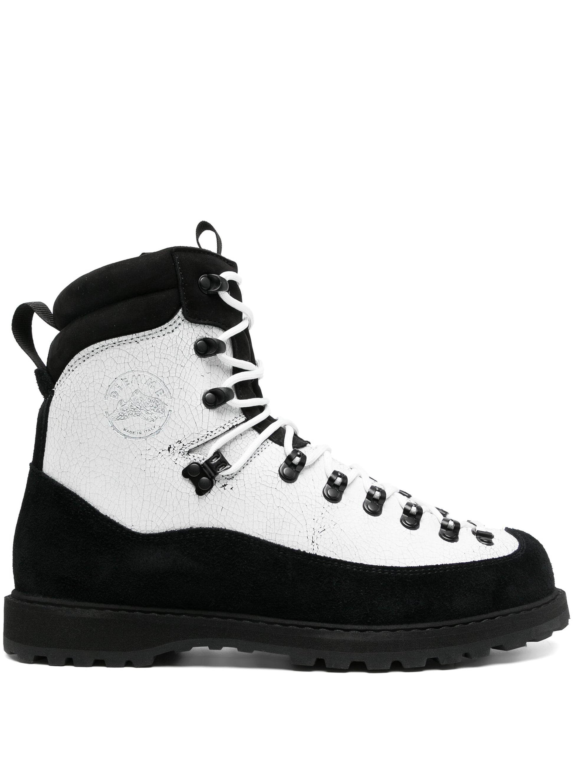 white/black calf leather two-tone design crinkled finish logo stamp to the side pull-tab at the tongue pull-tab at the heel padded ankle round toe front lace-up fastening branded insole ridged rubber sole