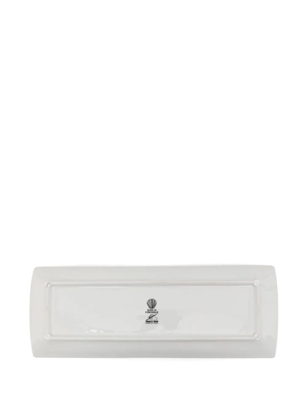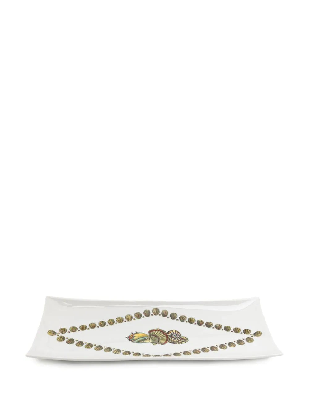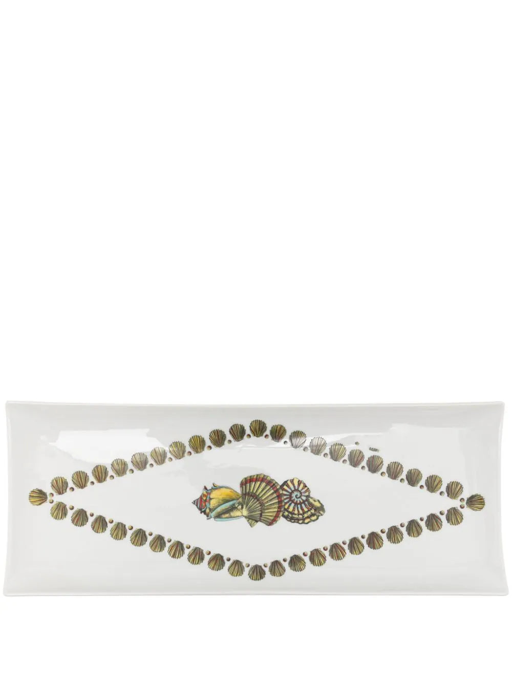 Giro di Conchiglie porcelain tray from FORNASETTI featuring white, multicolour, porcelain, high-shine finish, shell print, logo print to the rear and rectangle shape.
