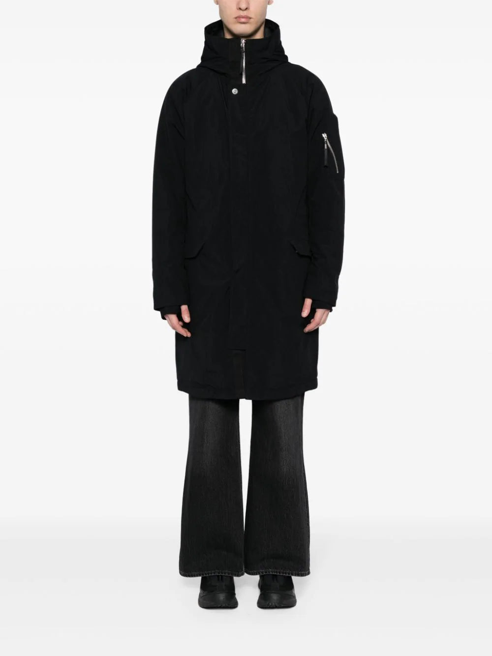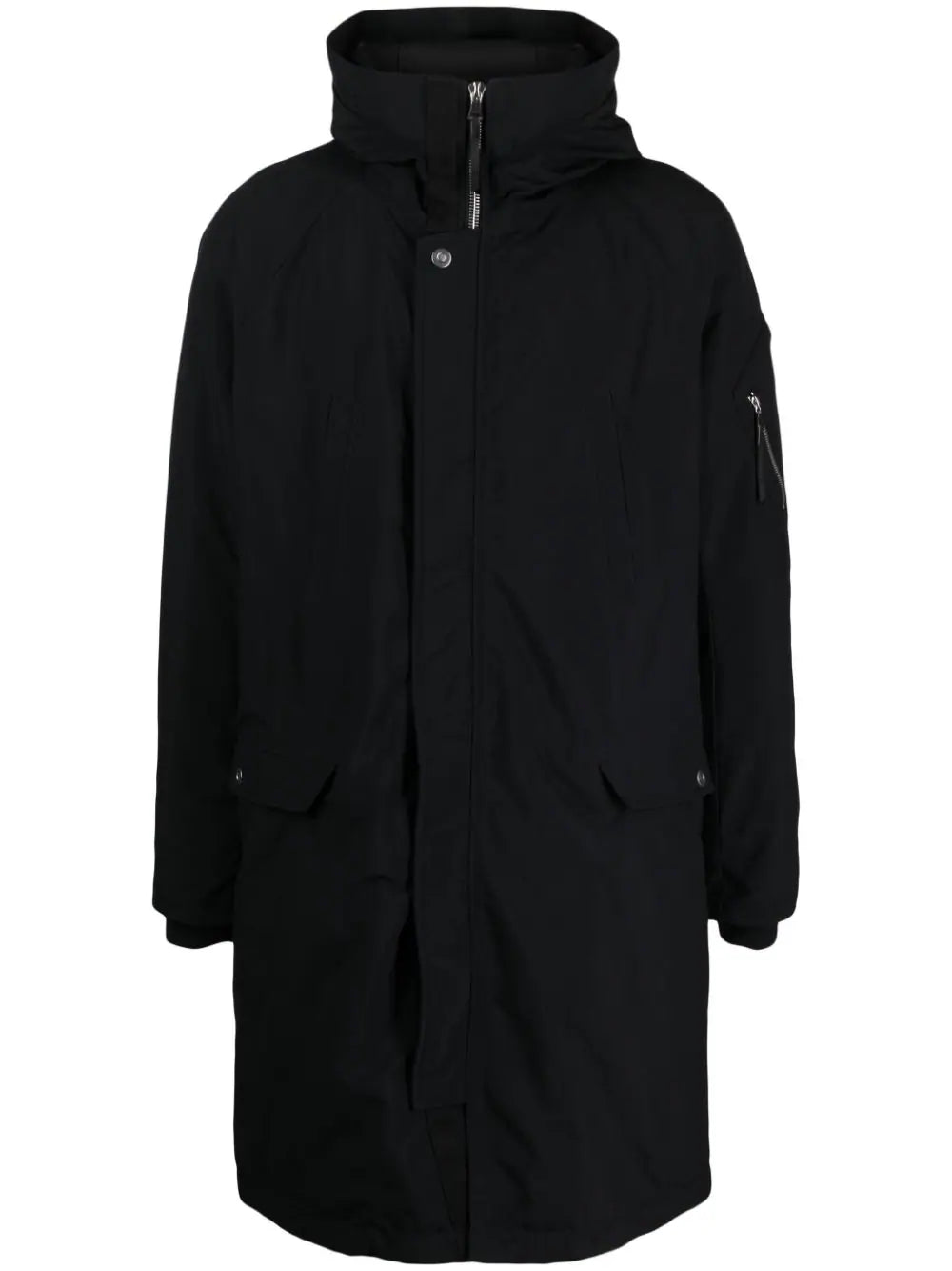 black cotton blend wind-resistant funnel neck classic hood front press-stud and zip fastening long raglan sleeves thumb slots sleeve zip pocket two chest welt pockets two front flap pockets long length straight hem
