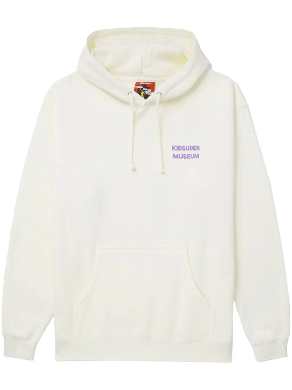 logo-print hoodie from KidSuper featuring ivory white, logo print at the chest, logo print to the rear, graphic print to the rear, drawstring hood, drop shoulder, long sleeves, front pouch pocket and straight hem.