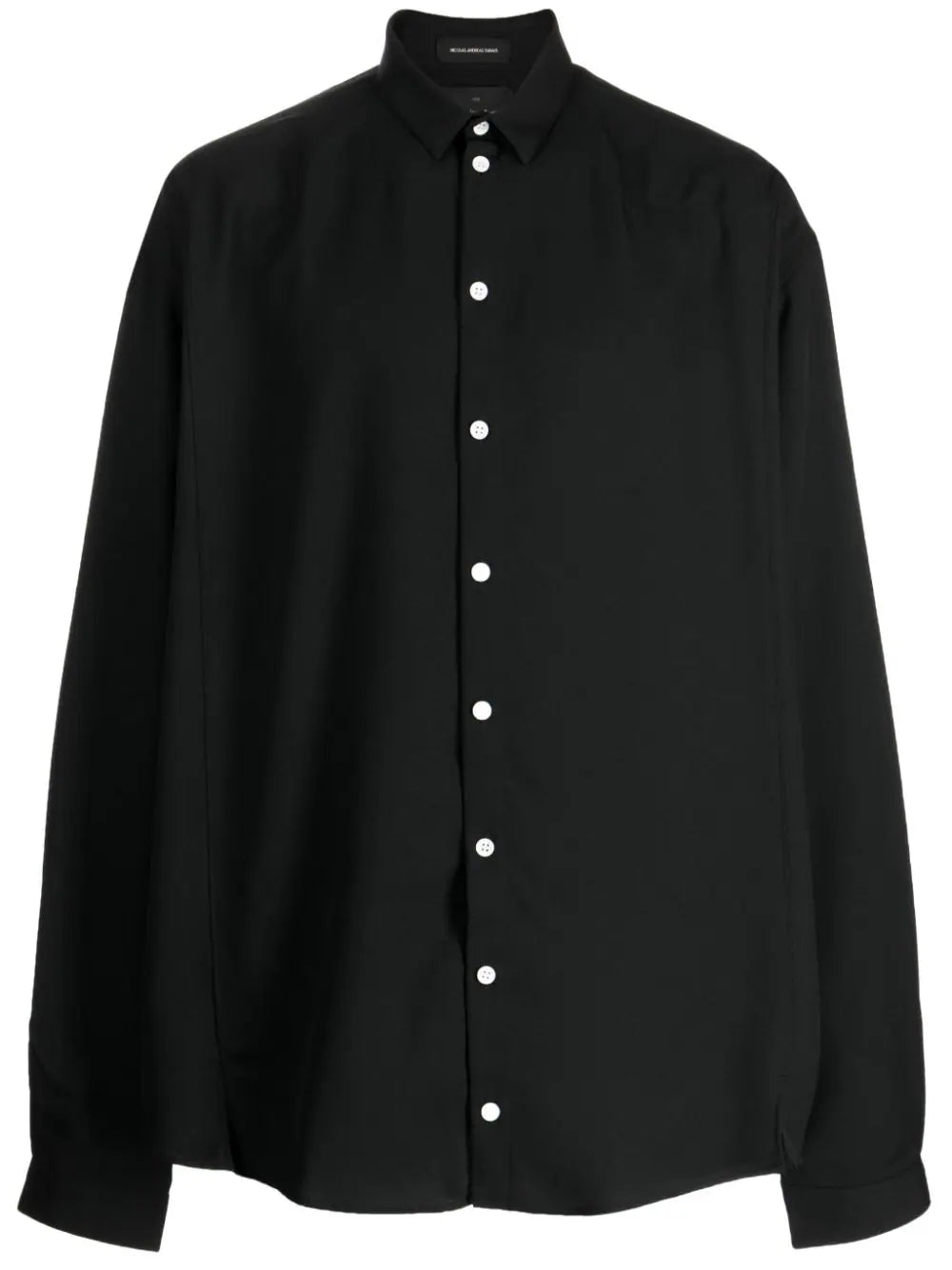 black recycled polyester funnel neck long sleeves buttoned cuffs front button fastening straight hem