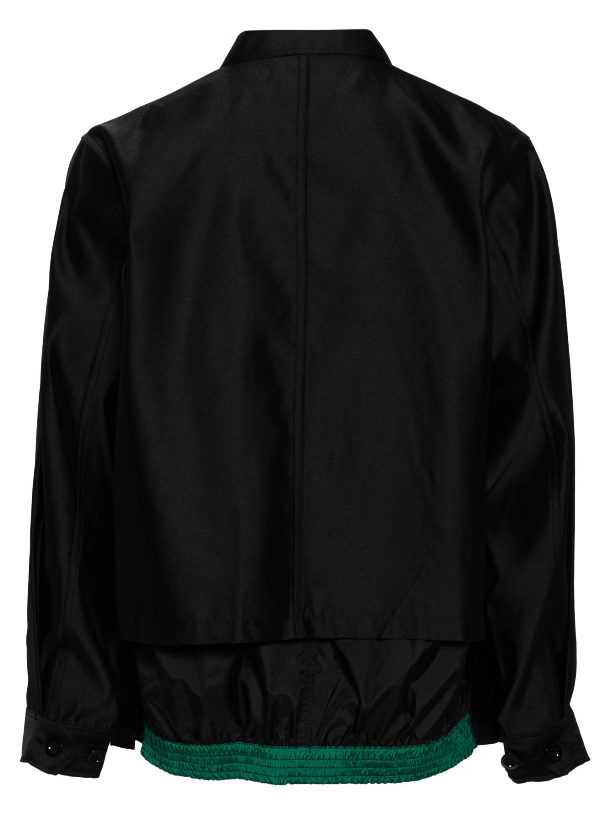 black satin finish classic collar concealed front fastening chest flap pockets long sleeves buttoned cuffs contrasting trim elasticated hem
