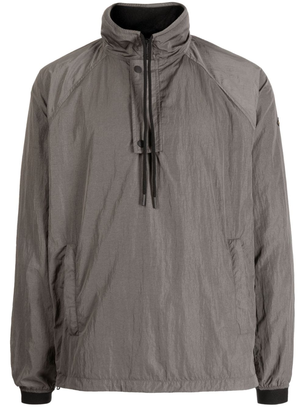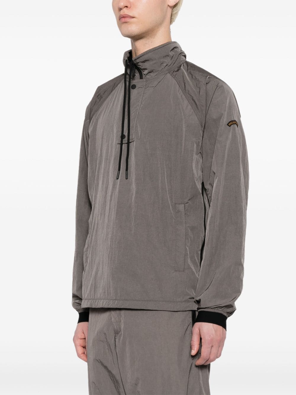 taupe grey appliqué logo drawstring neck press-stud placket pullover design long raglan sleeves ribbed cuffs two side zip-fastening welt pockets