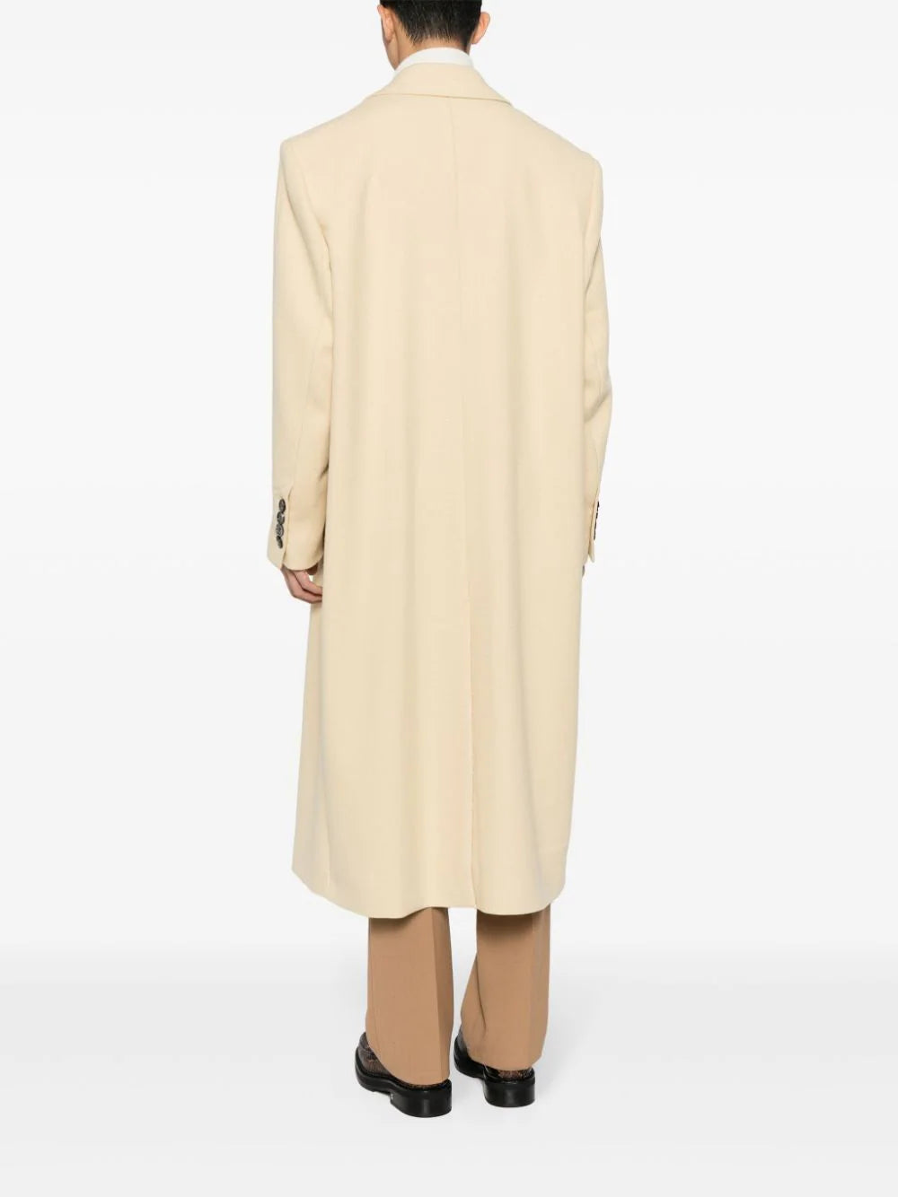 light beige virgin wool blend notched lapels long sleeves front button fastening buttoned cuffs slip pockets to the sides calf-length straight hem