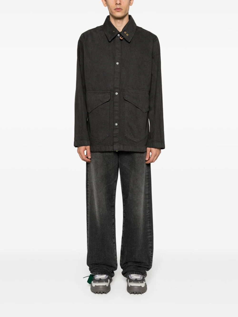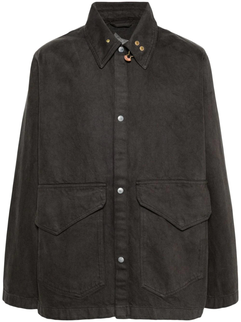 anthracite grey organic cotton-recycled polyester blend pointed flat collar front button fastening long sleeves two front flap pockets straight hem When buying this unisex item, keep in mind that it is graded in standard men's sizing.