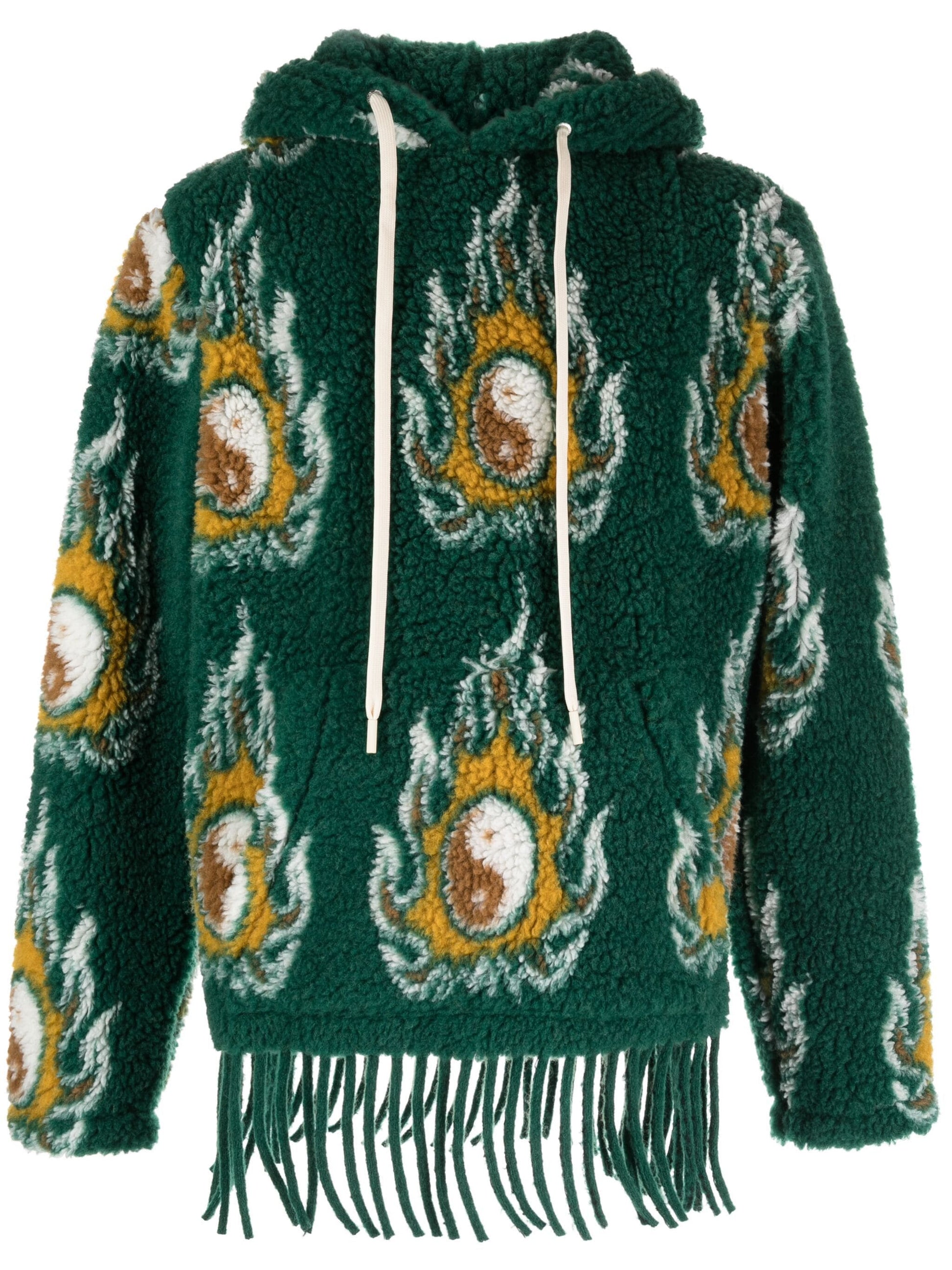 dark green/multicolour wool blend patterned jacquard fringed edge slouchy drawstring hood long sleeves front pouch pocket