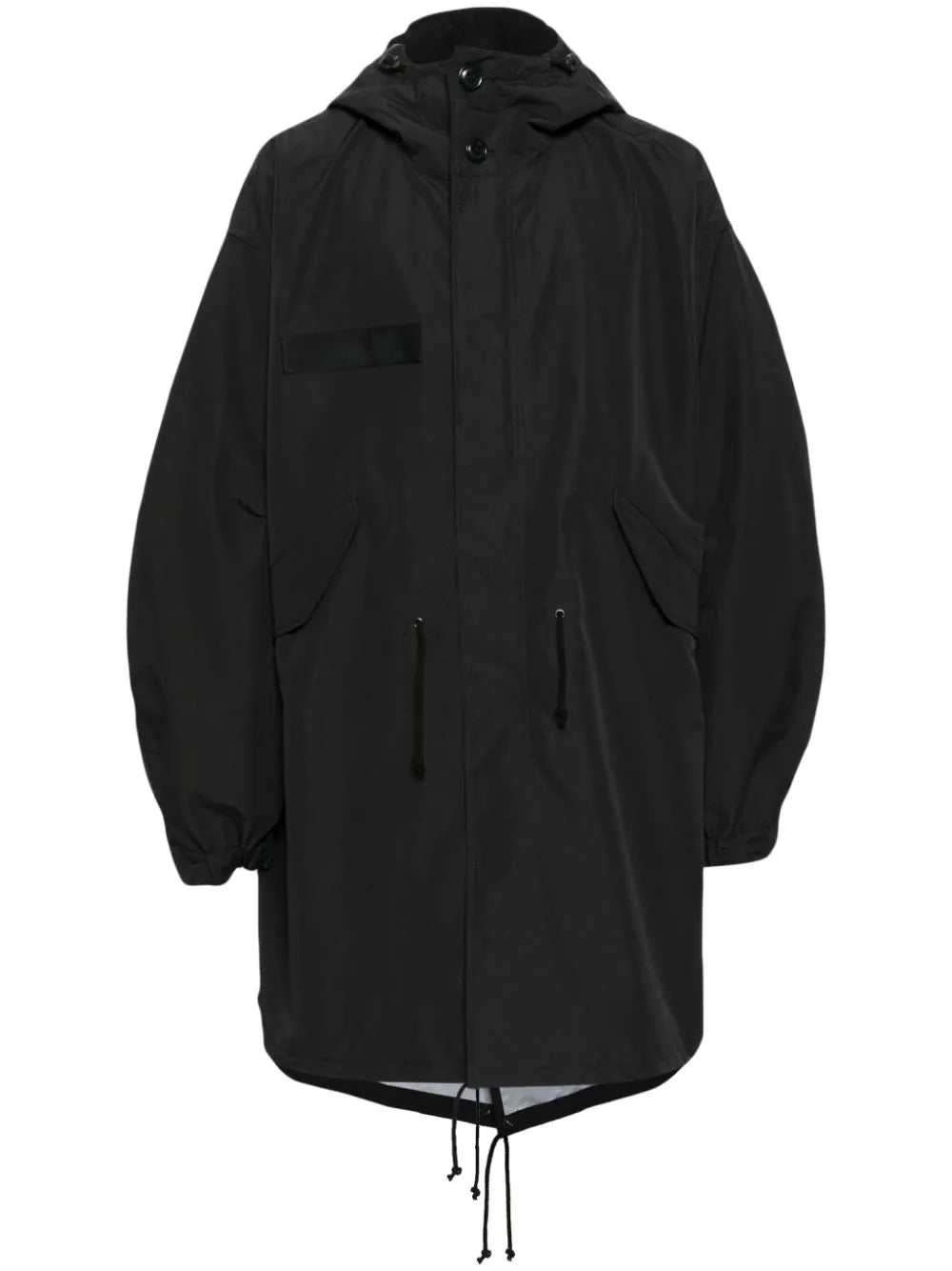 black grosgrain ribbon trim high neck drawstring hood front button and zip fastening drop shoulder elasticated cuffs drawstring waist two side flap pockets mid-length drawstring hem