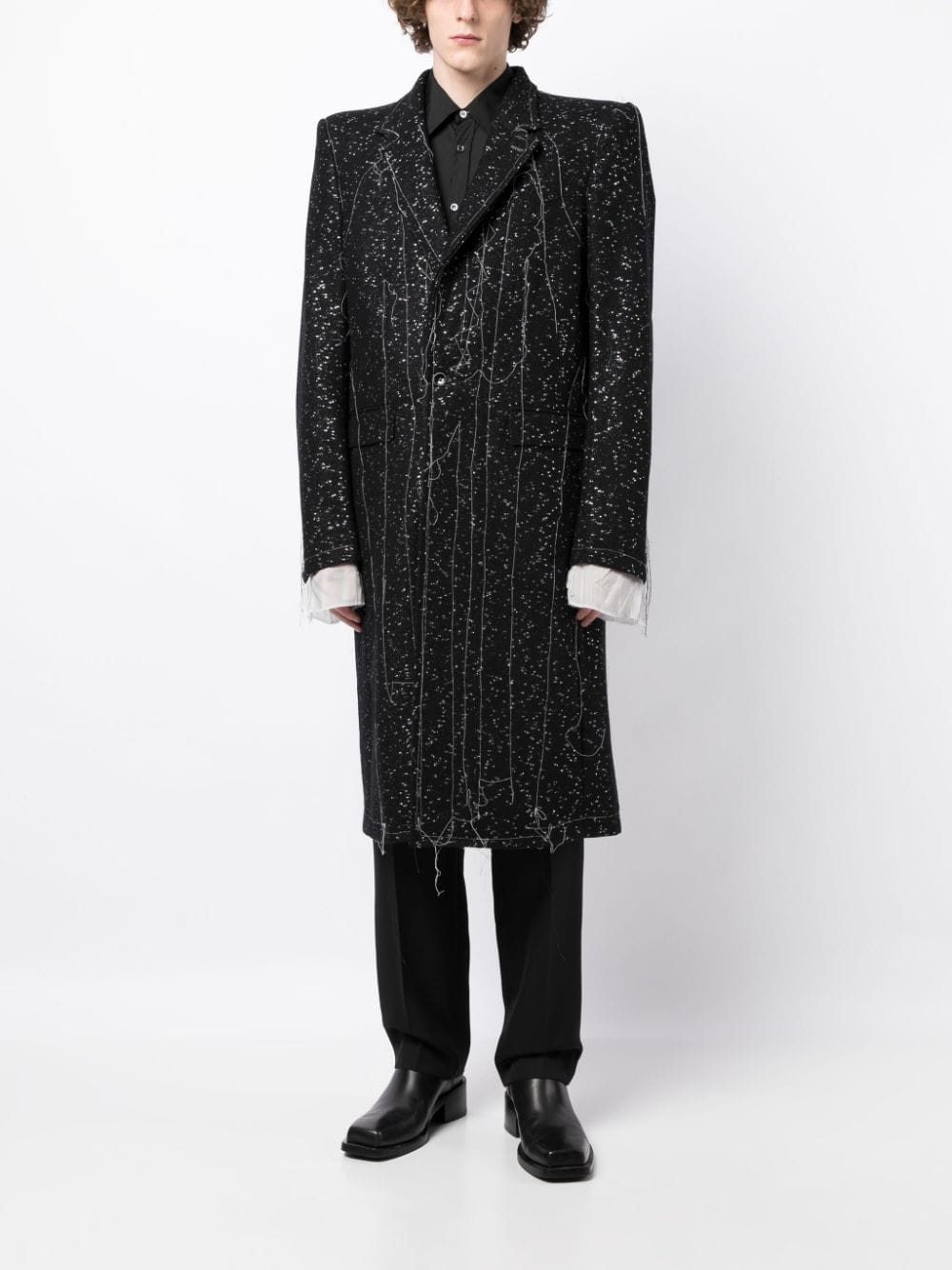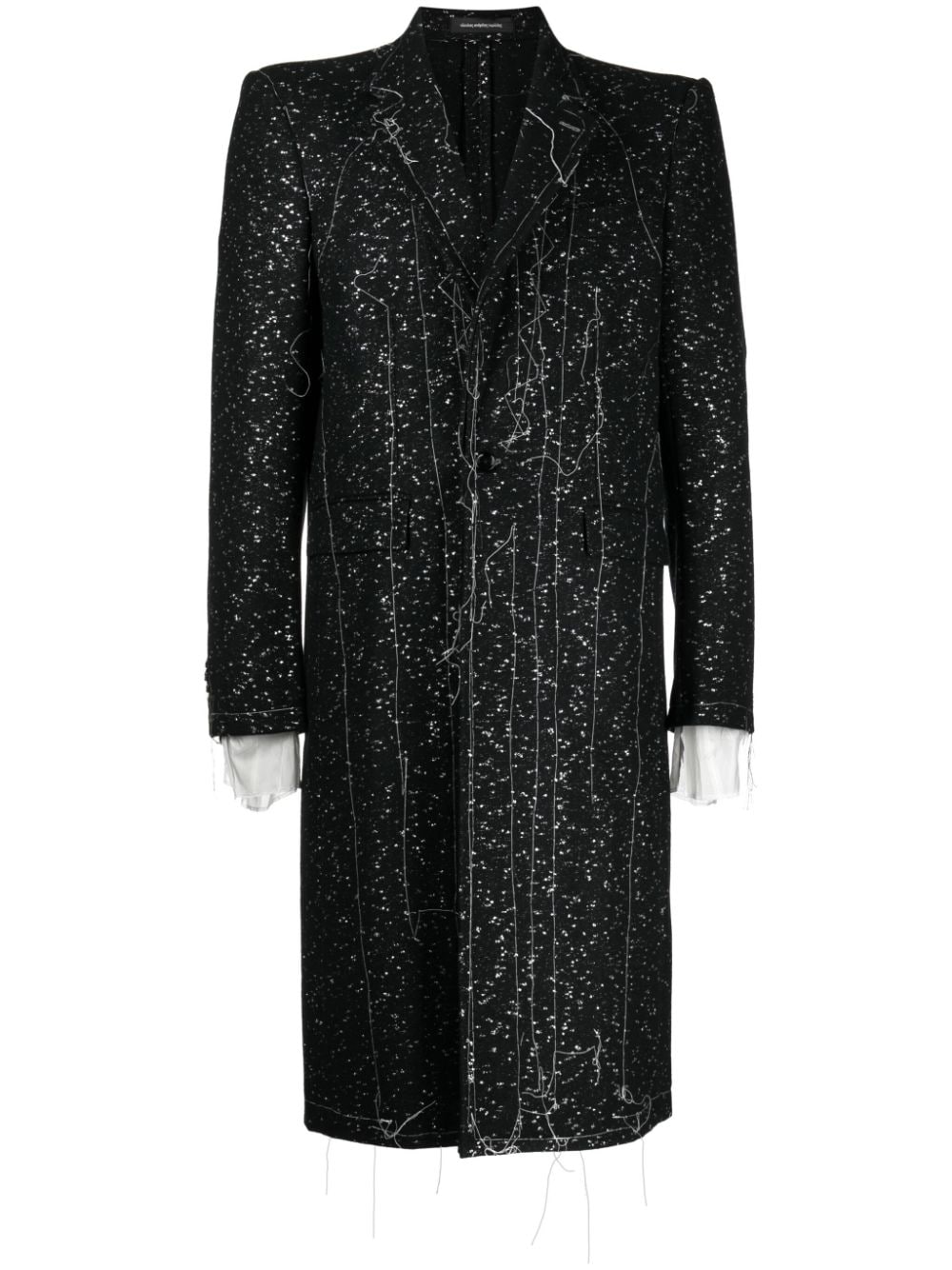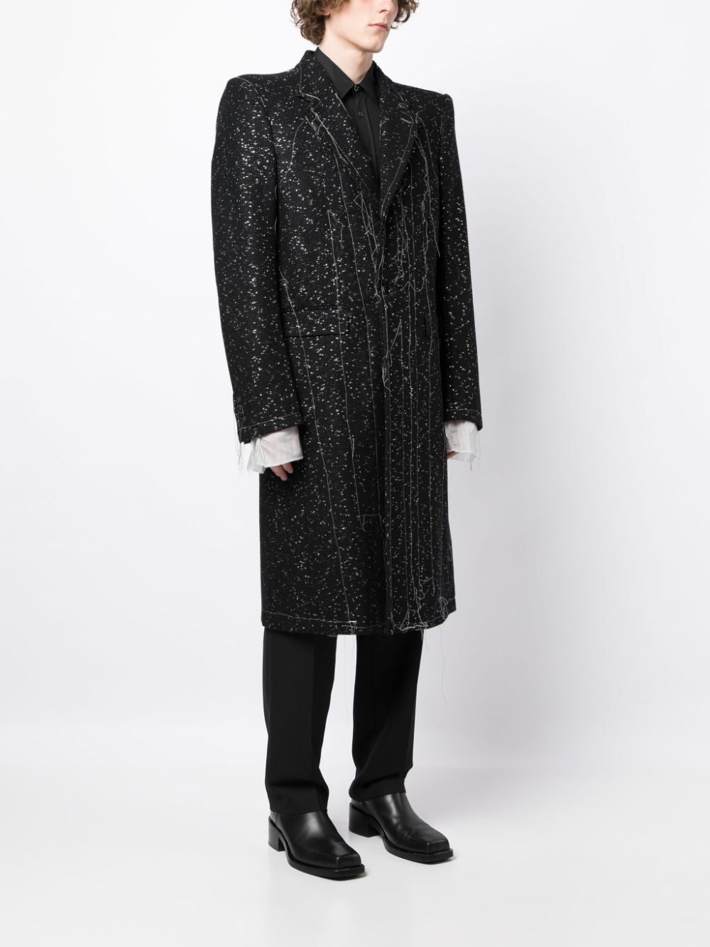 exposed-seam single-breasted coat from NICOLAS ANDREAS TARALIS featuring black/white, silver-tone, wool blend, exposed-seam detailing, notched lapels, front button fastening, shoulder pads, long sleeves, jetted chest pocket, two front flap pockets, straight hem and below-knee length.