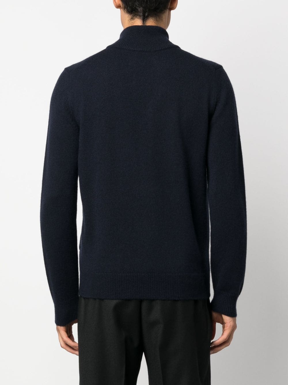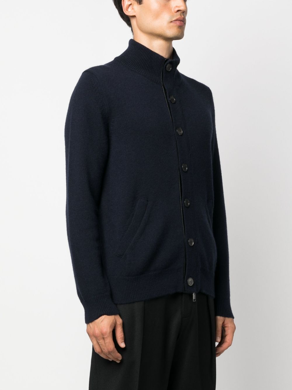 leather-trimmed cashmere cardigan from BRIONI featuring navy blue, cashmere, fine knit, leather trim, concealed front zip fastening, front button fastening, long sleeves, two diagonal pockets to the sides and ribbed-knit edge.