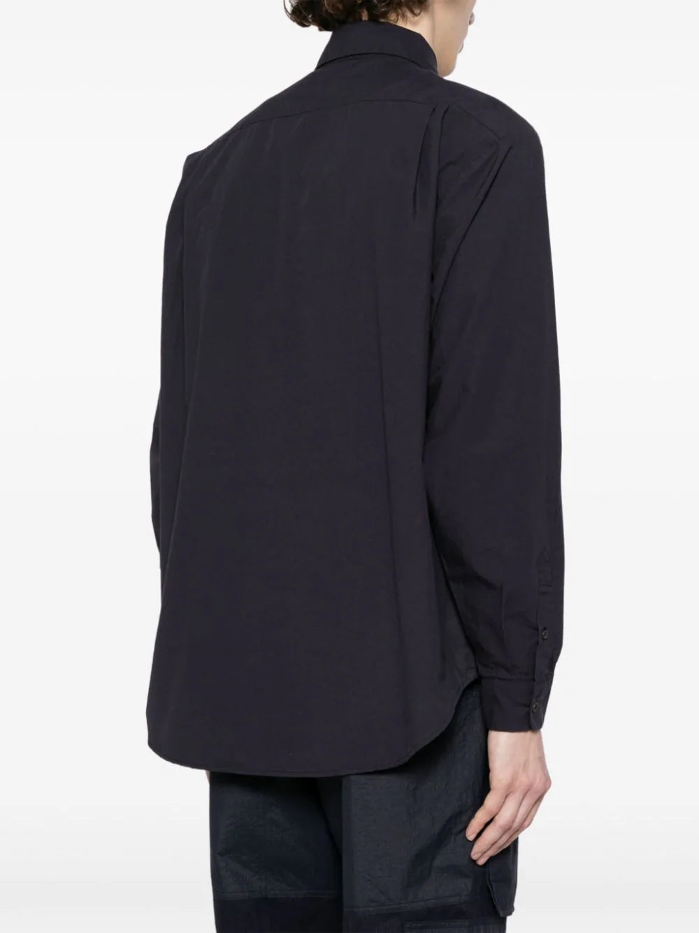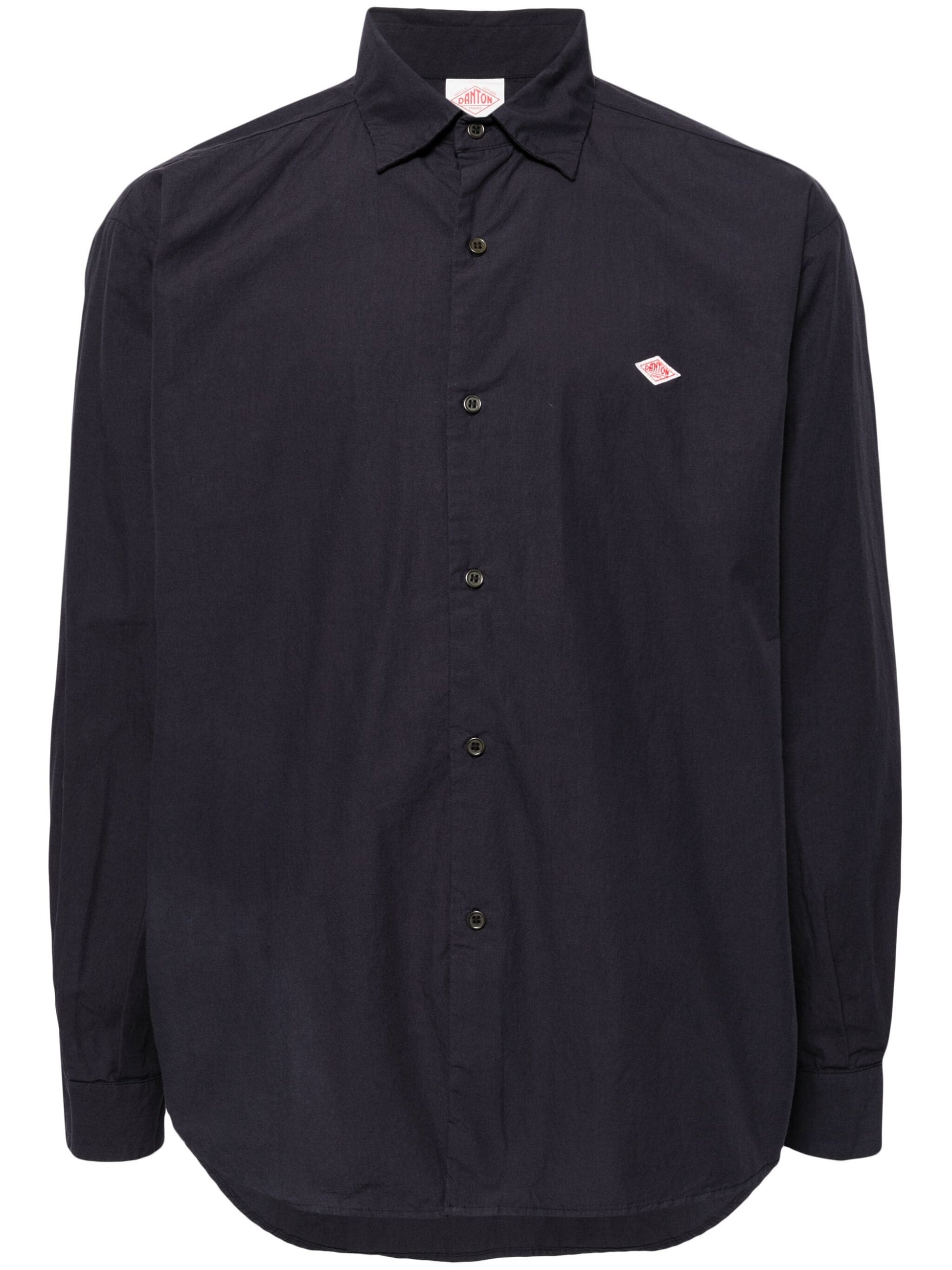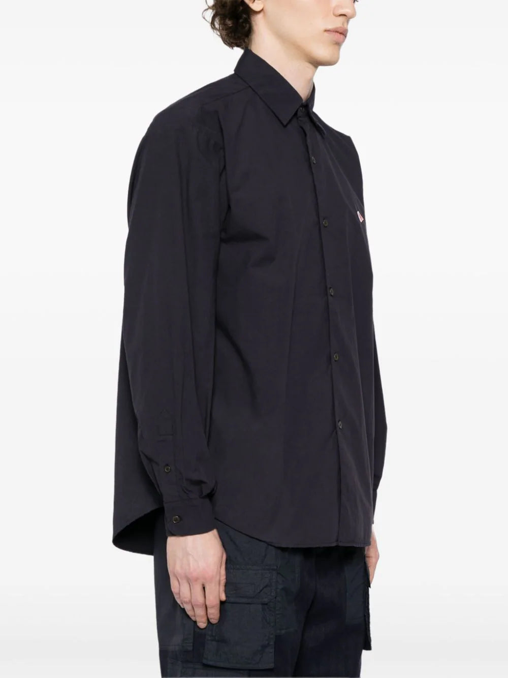 navy blue cotton appliqué logo spread collar front button fastening long sleeves buttoned cuffs curved hem