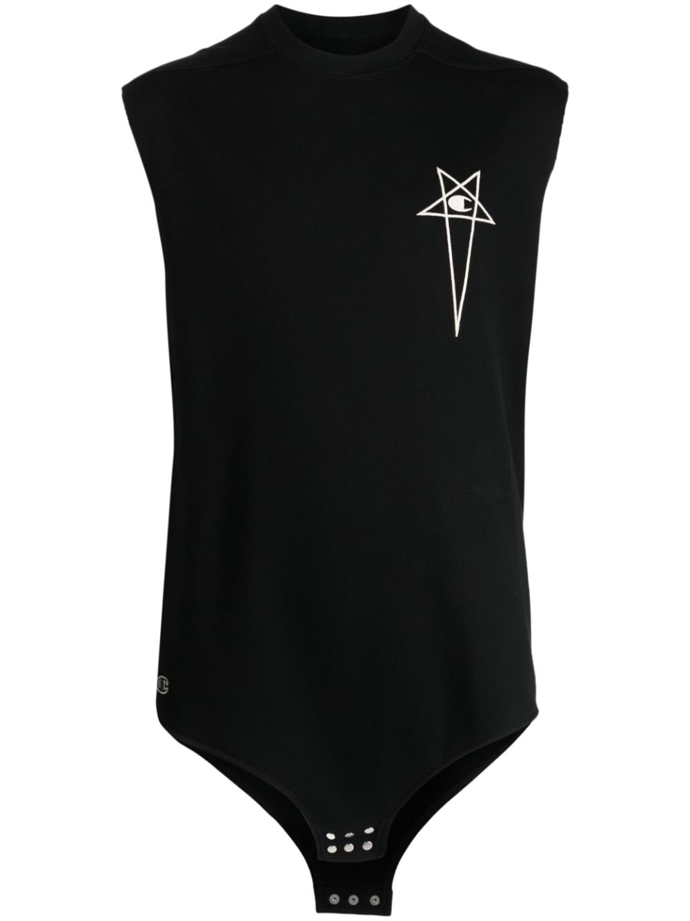 logo-embroidered cotton tank top from Rick Owens X Champion featuring black, cotton, embroidered logo at the chest, silver-tone hardware, crew neck, snap-fit fastening and sleeveless.