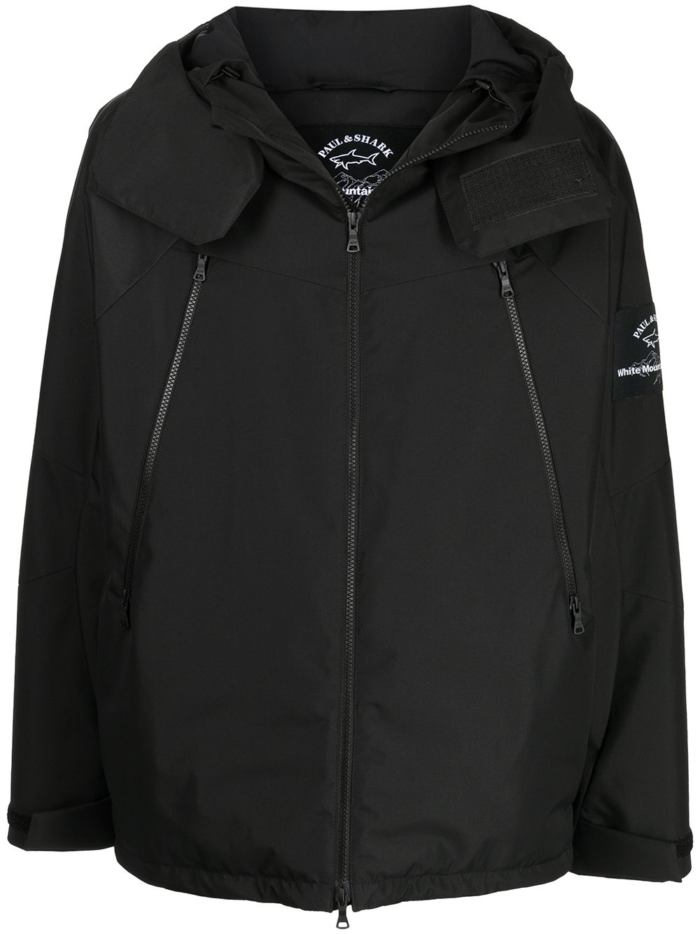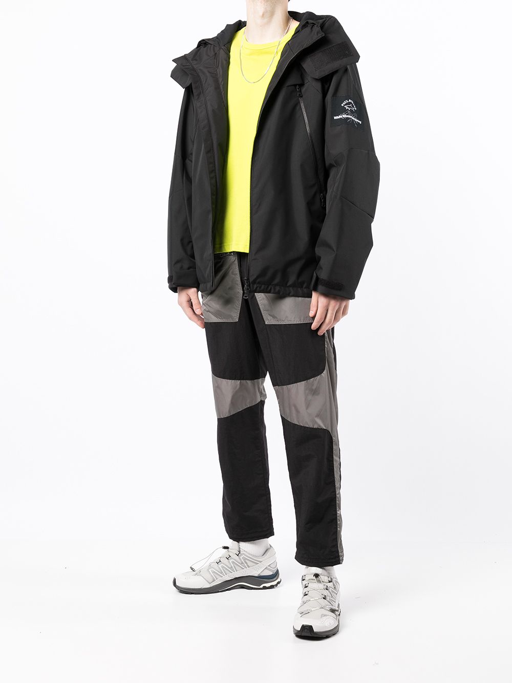 Black logo-patch hooded jacket from WHITE MOUNTAINEERING featuring logo patch at the sleeve, front zip fastening pockets, front zip fastening, classic hood, long sleeves and straight hem.