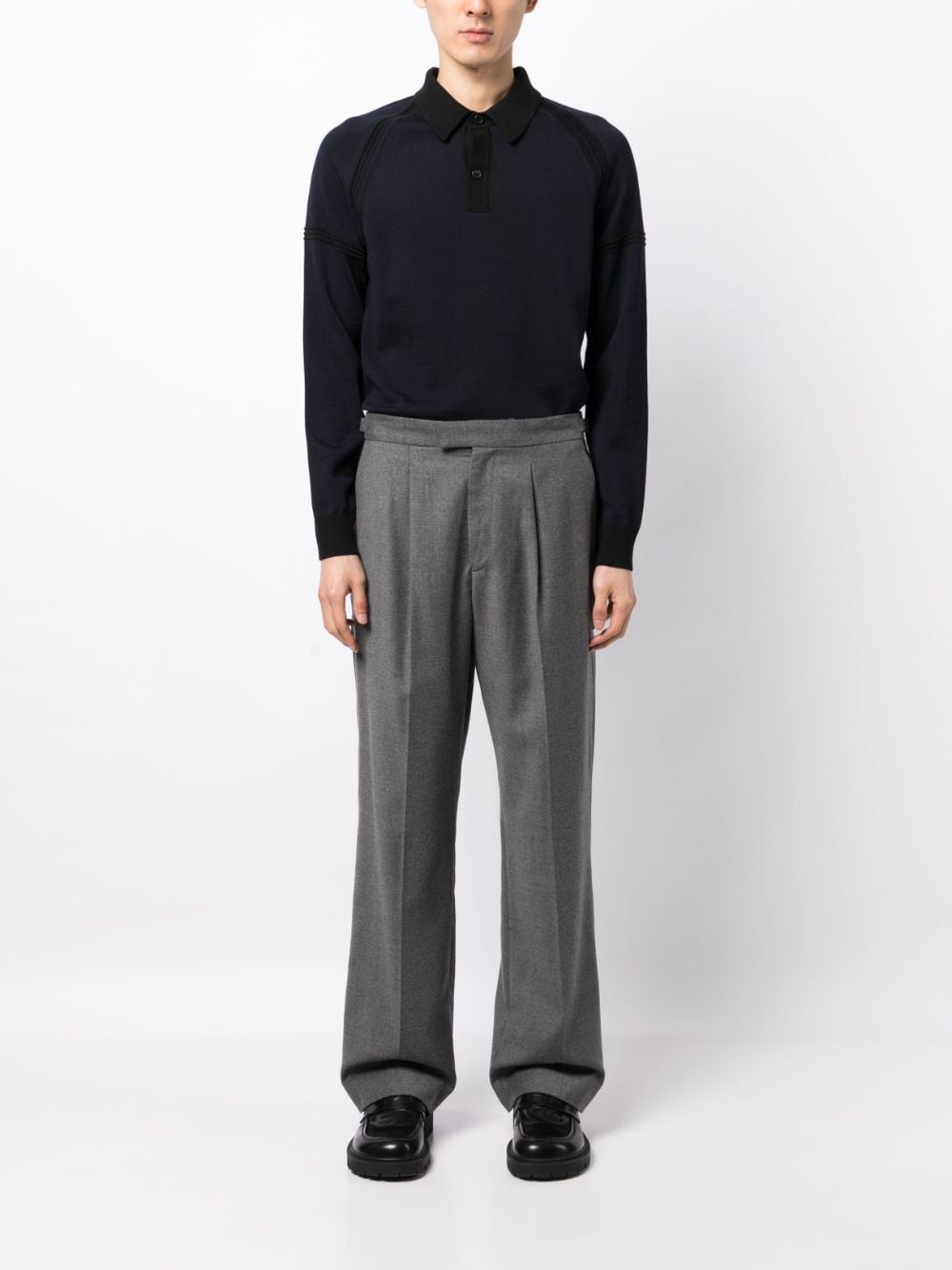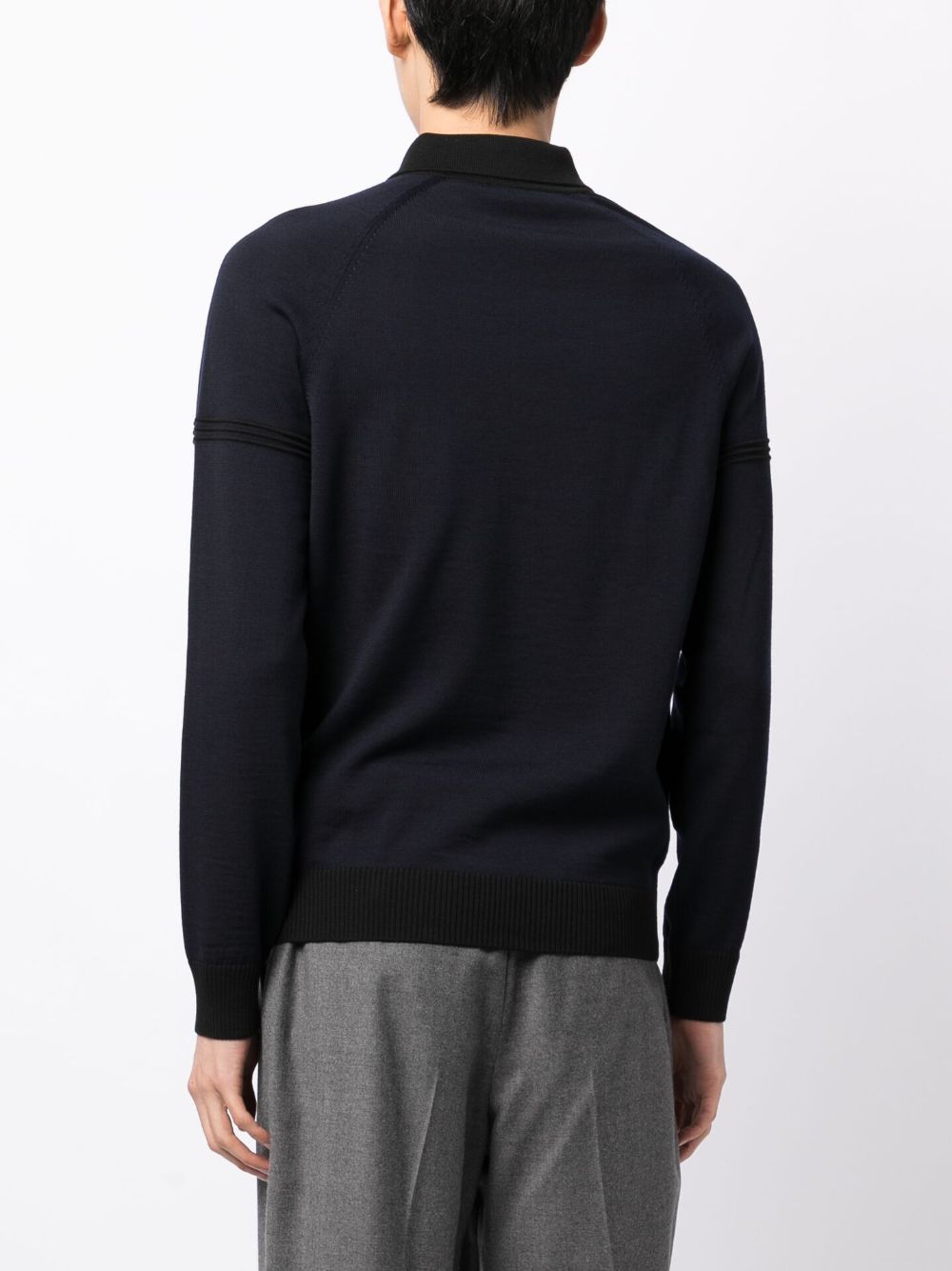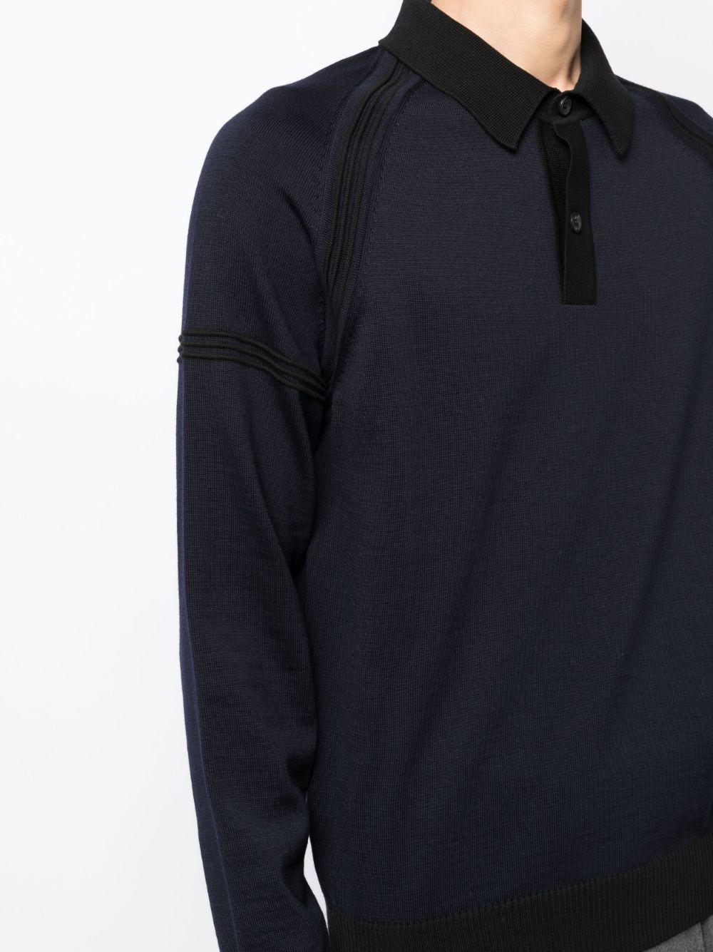 long raglan-sleeve wool polo shirt from DUNHILL featuring midnight blue, wool, knitted construction, stripe detailing, polo collar, short front button fastening, long raglan sleeves and ribbed cuffs and hem.