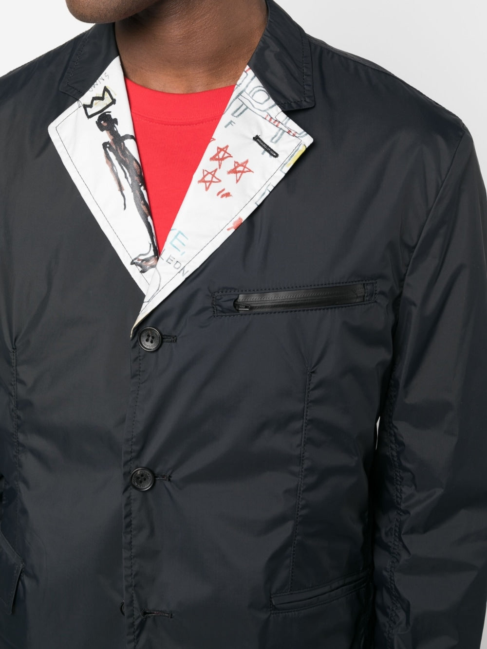 single-breasted sketch-print blazer from Junya Watanabe MAN featuring black, notched lapels, sketch-style print, front button fastening, long sleeves, chest welt pocket, front welt pocket and front flap pocket.