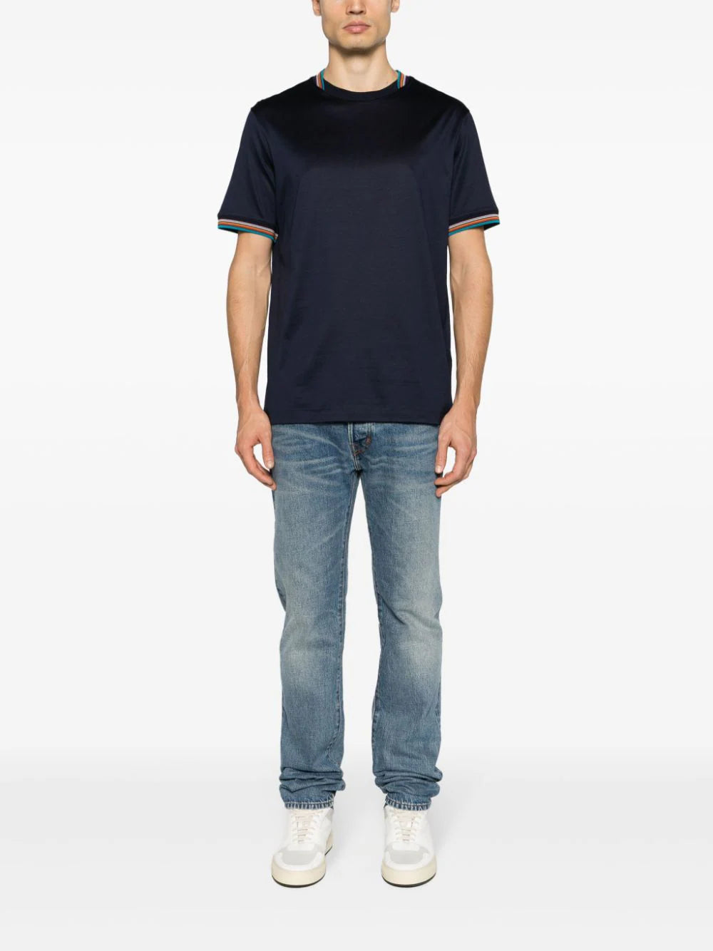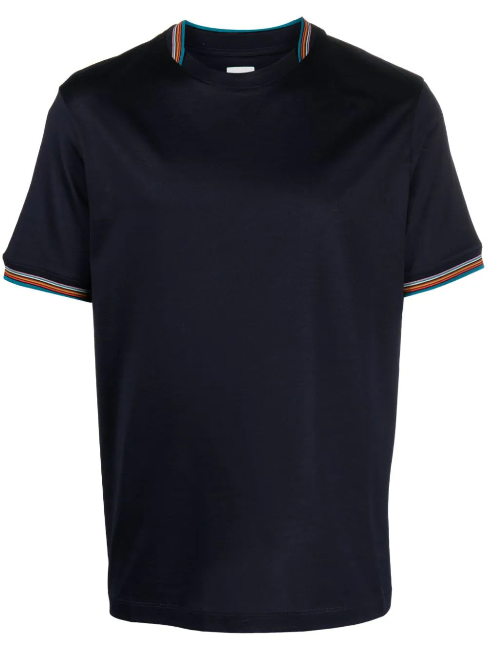 navy blue cotton jersey texture stripe trim round neck short sleeves straight hem
