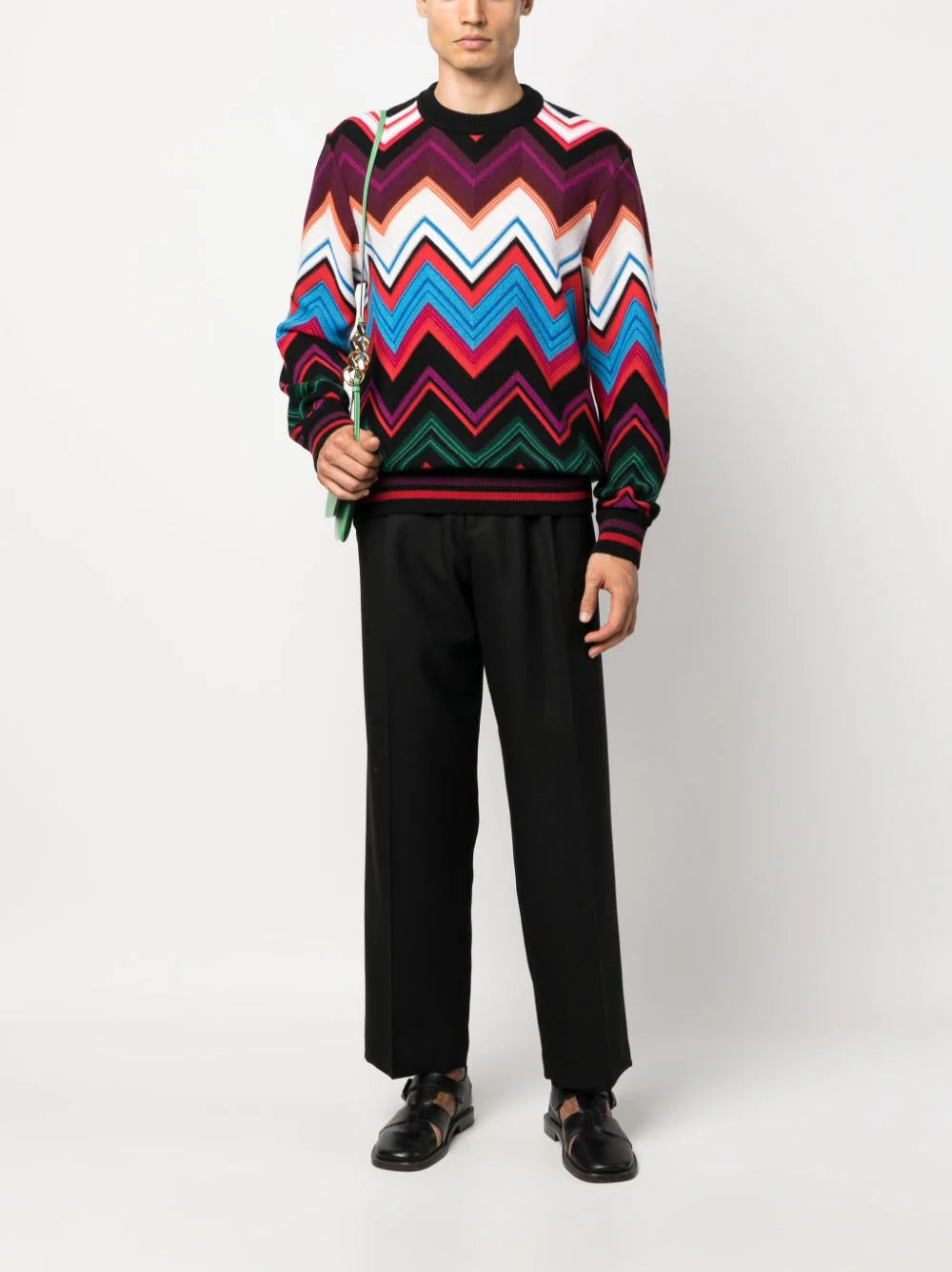 zigzag crew-neck jumper from MISSONI featuring black/multicolour, wool-cotton blend, knitted construction, full jacquard, zigzag print, striped edge, crew neck, long sleeves, ribbed cuffs and hem and straight hem. The item you receive may differ slightly from the item photographed. This is due to the artisanal nature with which all Missoni products are constructed..