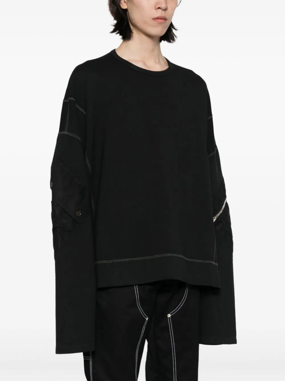 black cotton crew neck decorative zip detailing drop shoulder extra-long sleeves straight hem