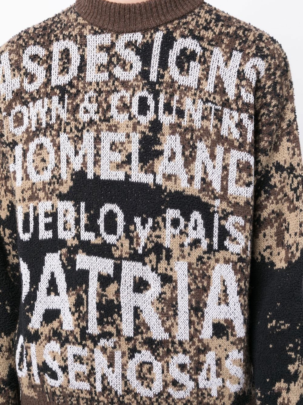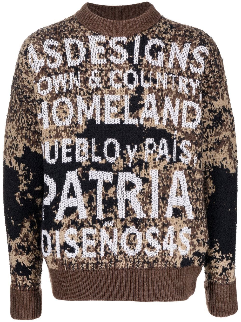 slogan intarsia-knit sweatshirt from 4SDESIGNS featuring brown, beige, white, cotton-wool blend, intarsia knit, ribbed edge, embroidered slogan, crew neck and long sleeves.