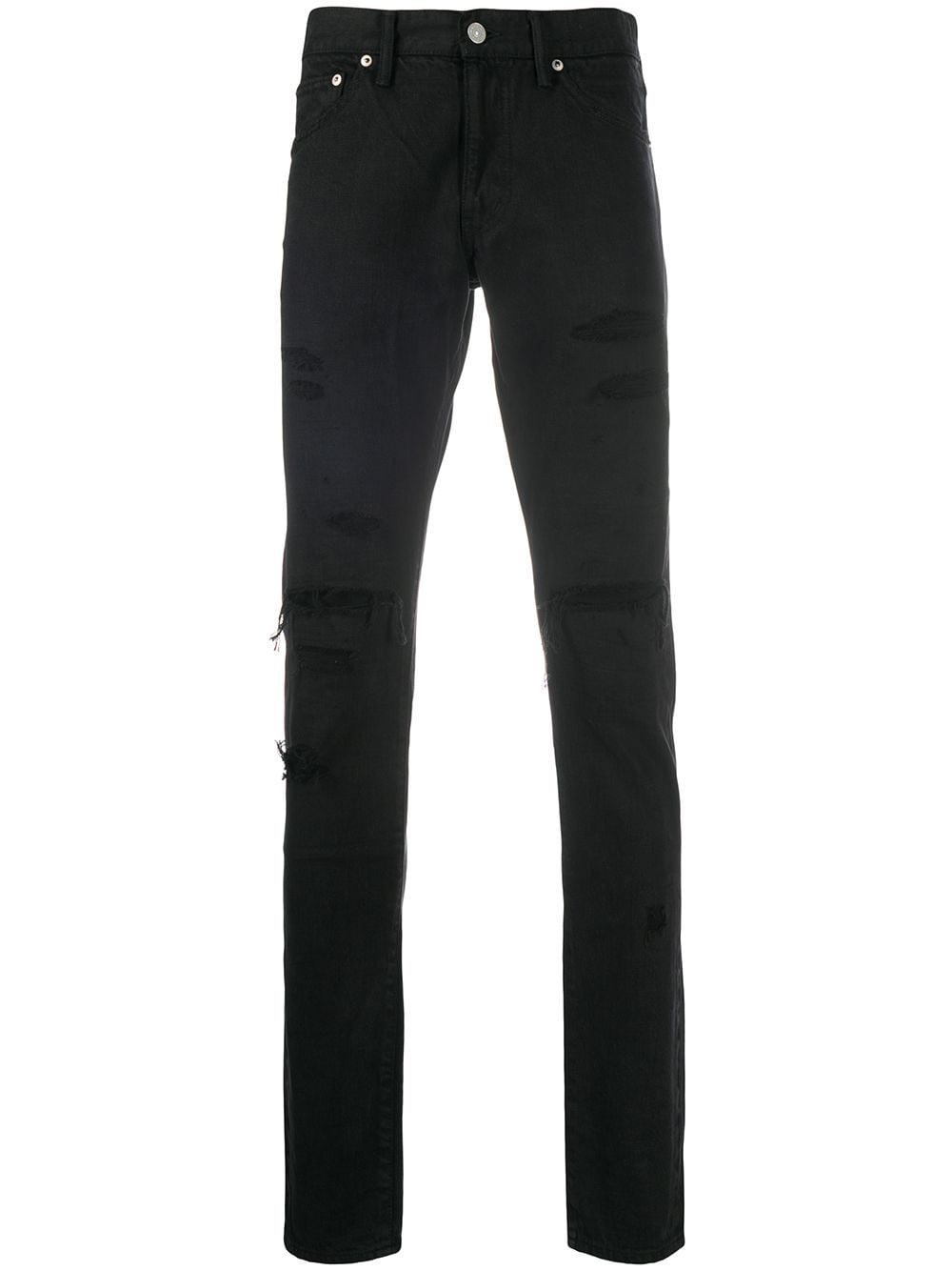 Black cotton distressed slim-fit jeans from visvim featuring distressed finish, slim fit, button fastening, belt loops and classic five pockets.