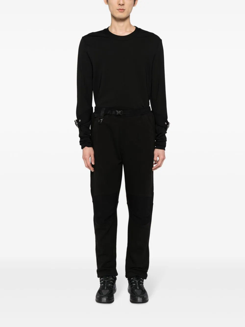 black organic cotton panelled design belt loops buckle fastening mid-rise straight leg drawstring hem two side inset pockets rear zip-fastening pocket rear button-fastening pocket