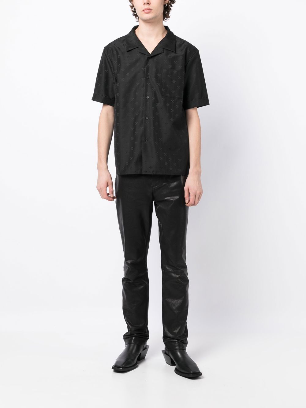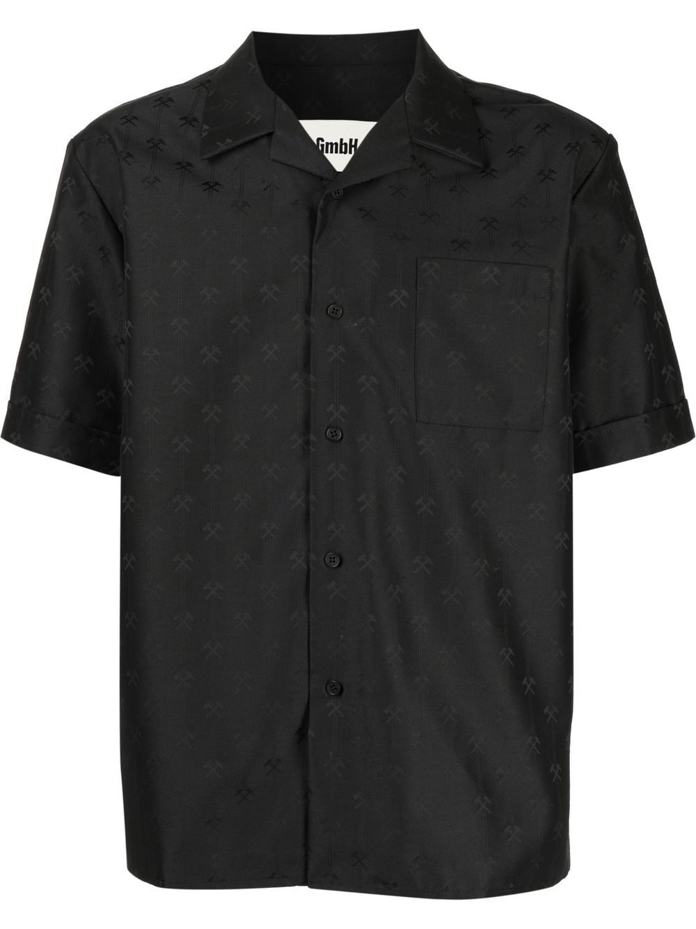 all-over logo print shirt from GmbH featuring black, wool blend, all-over logo print, front button fastening, chest patch pocket, camp collar, short sleeves and straight hem.