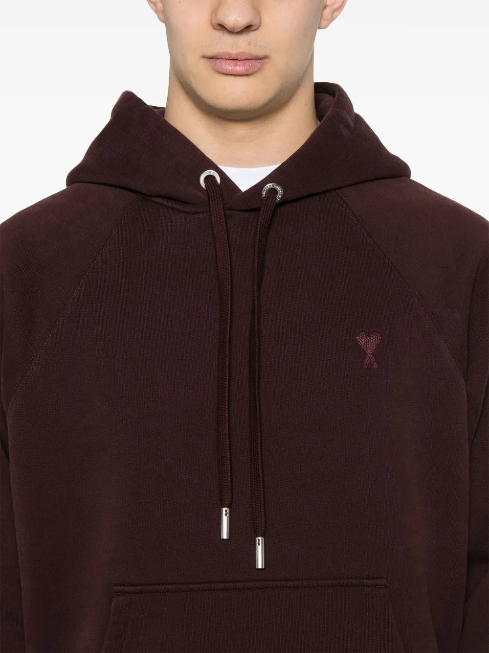 This Ami-De-Coeur-Motif Hoodie offers a stylish and comfortable look with a chocolate brown front pouch pocket, ribbed cuffs, and hem. Its unisex design is graded in standard men's sizing, making it a versatile addition to any wardrobe.