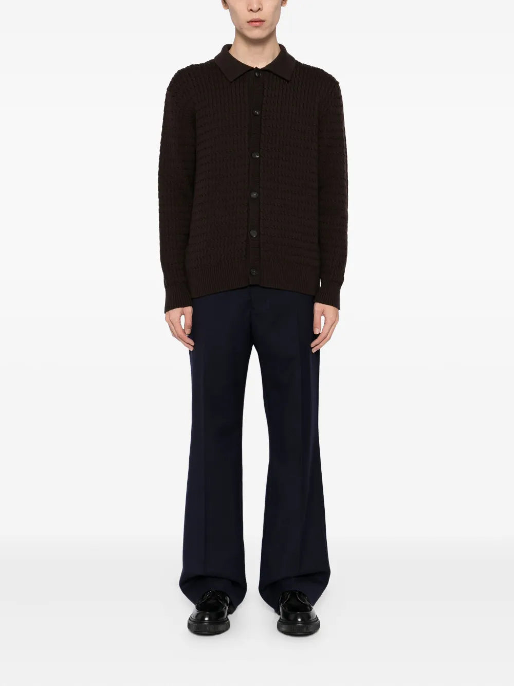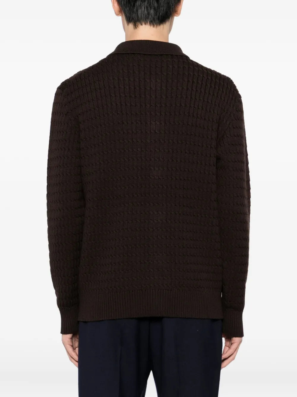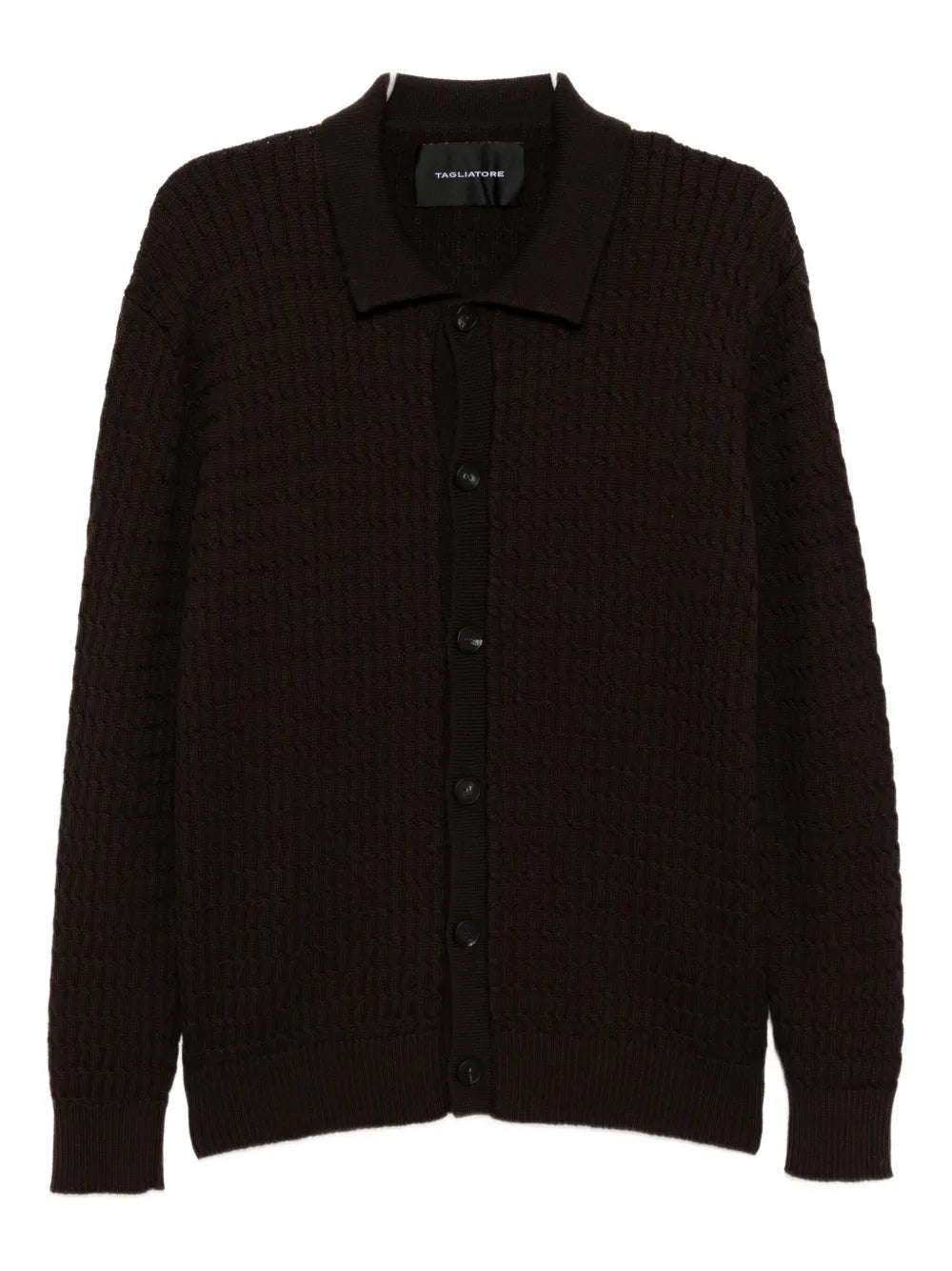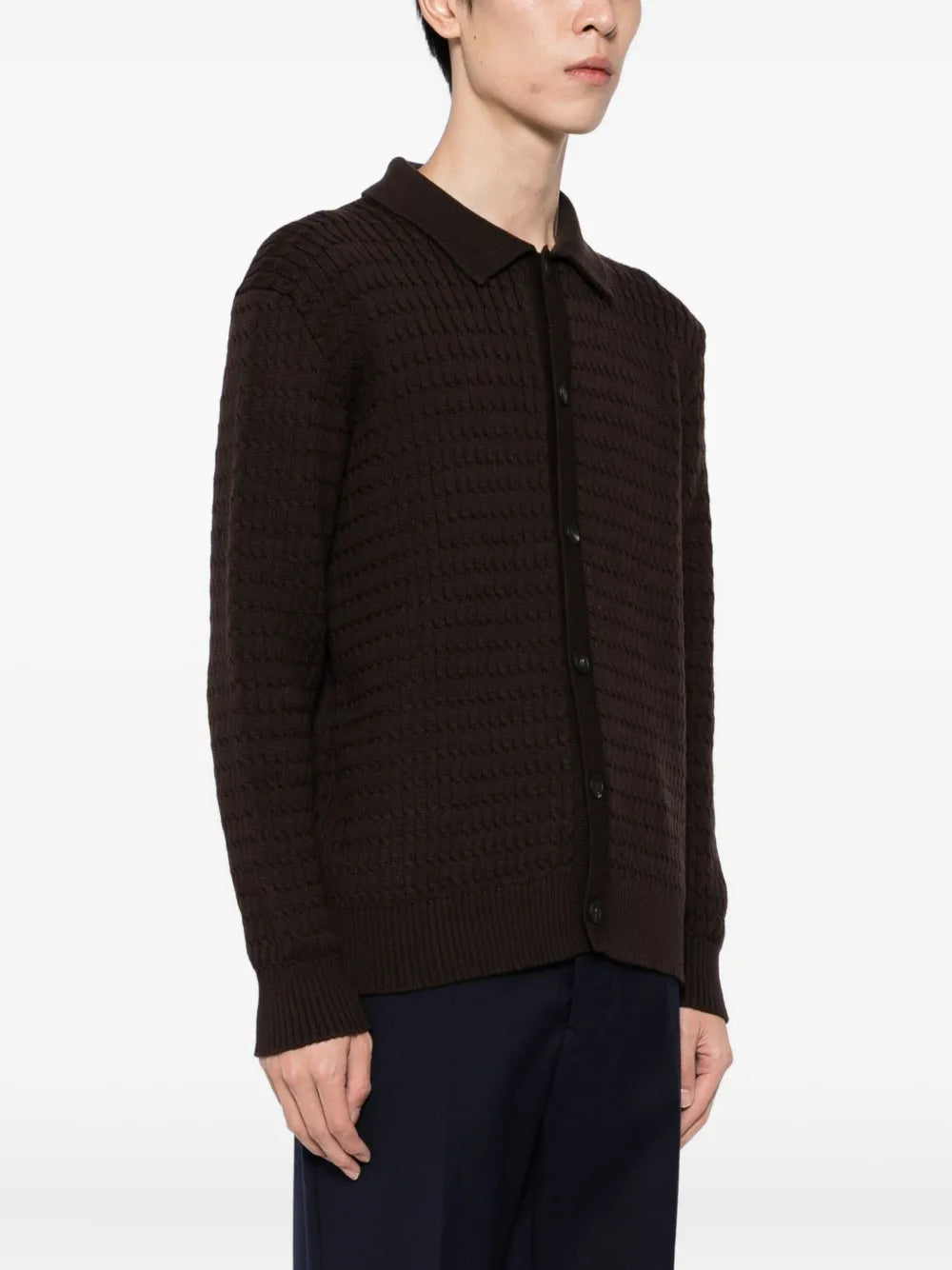 The Anson Cardigan in dark brown features a front button fastening and a classic spread collar for a polished look. Its long sleeves are finished with ribbed cuffs and hem, ensuring a comfortable fit and added durability. This cardigan combines timeless style with practical details, ideal for layering in any professional wardrobe.