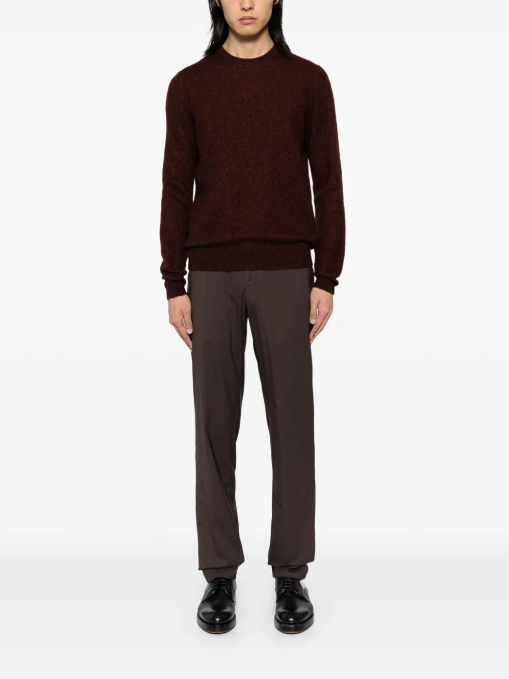 dark brown cashmere-silk blend knitted construction brushed effect crew neck long sleeves ribbed cuffs and hem
