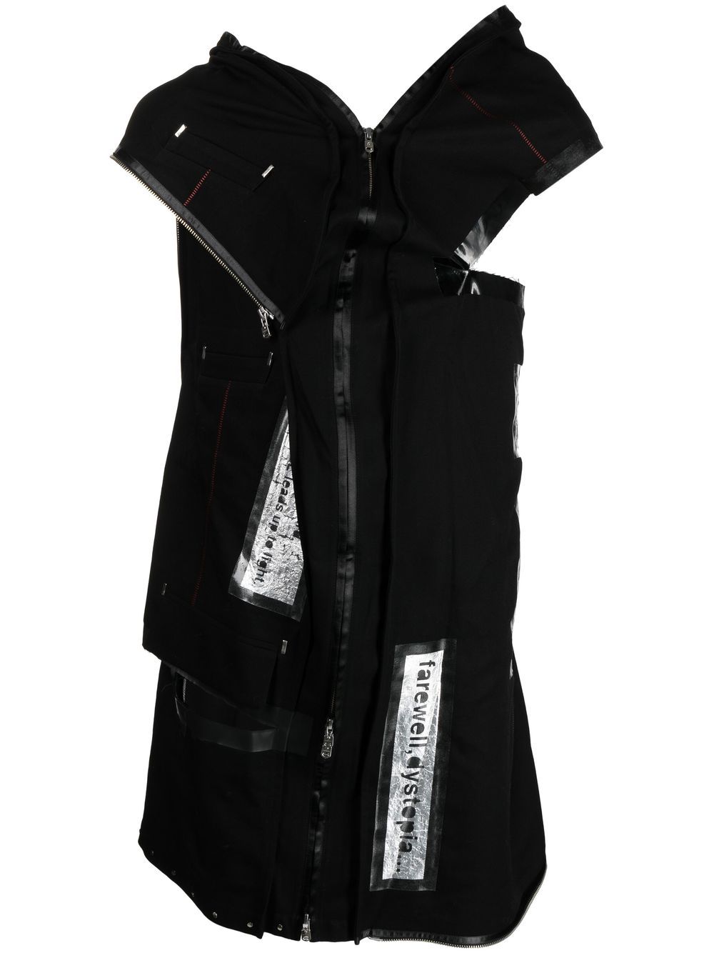 asymmetrical distressed sleeveless jacket from TAKAHIROMIYASHITA The SoloIst featuring black/white, cotton, wool, distressed effect, asymmetric design, sleeveless and decorative zip detailing.