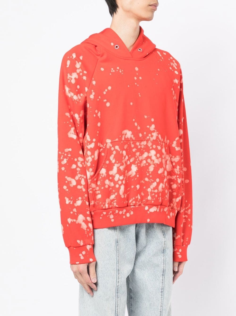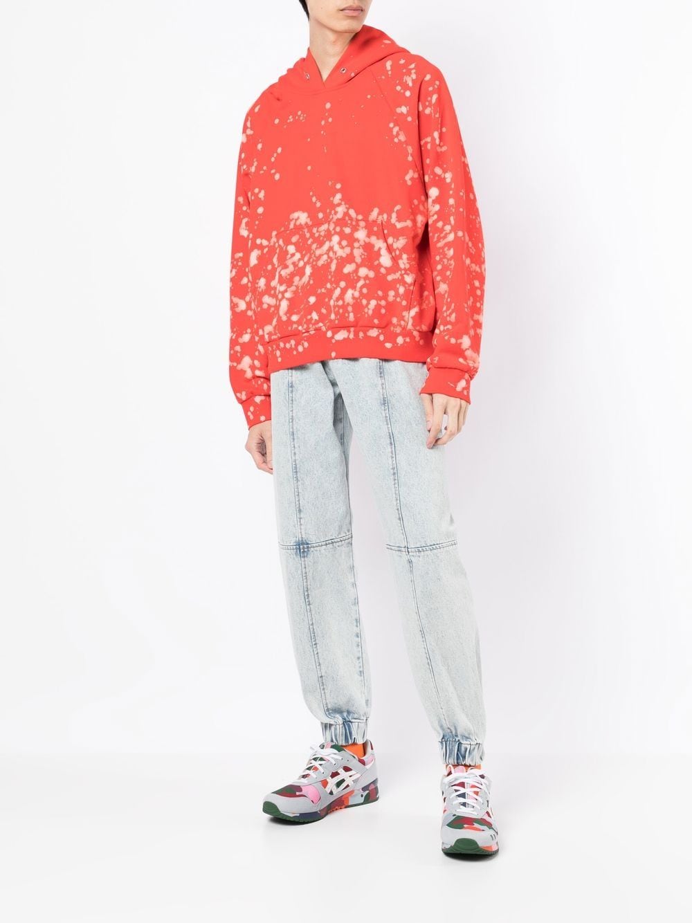 bleach-splash cotton hoodie from Liberal Youth Ministry featuring light red, cotton, classic hood, long sleeves, straight hem, front pouch pocket and bleach-splash effect.