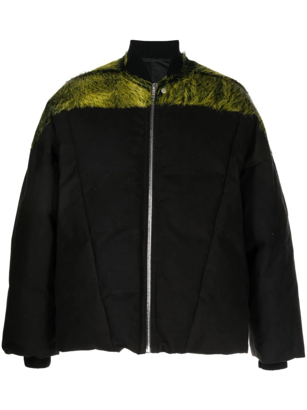black/bright green stretch-cotton calf hair goose down padded design colour-block panelled design brushed effect high neck front zip fastening long sleeves straight hem