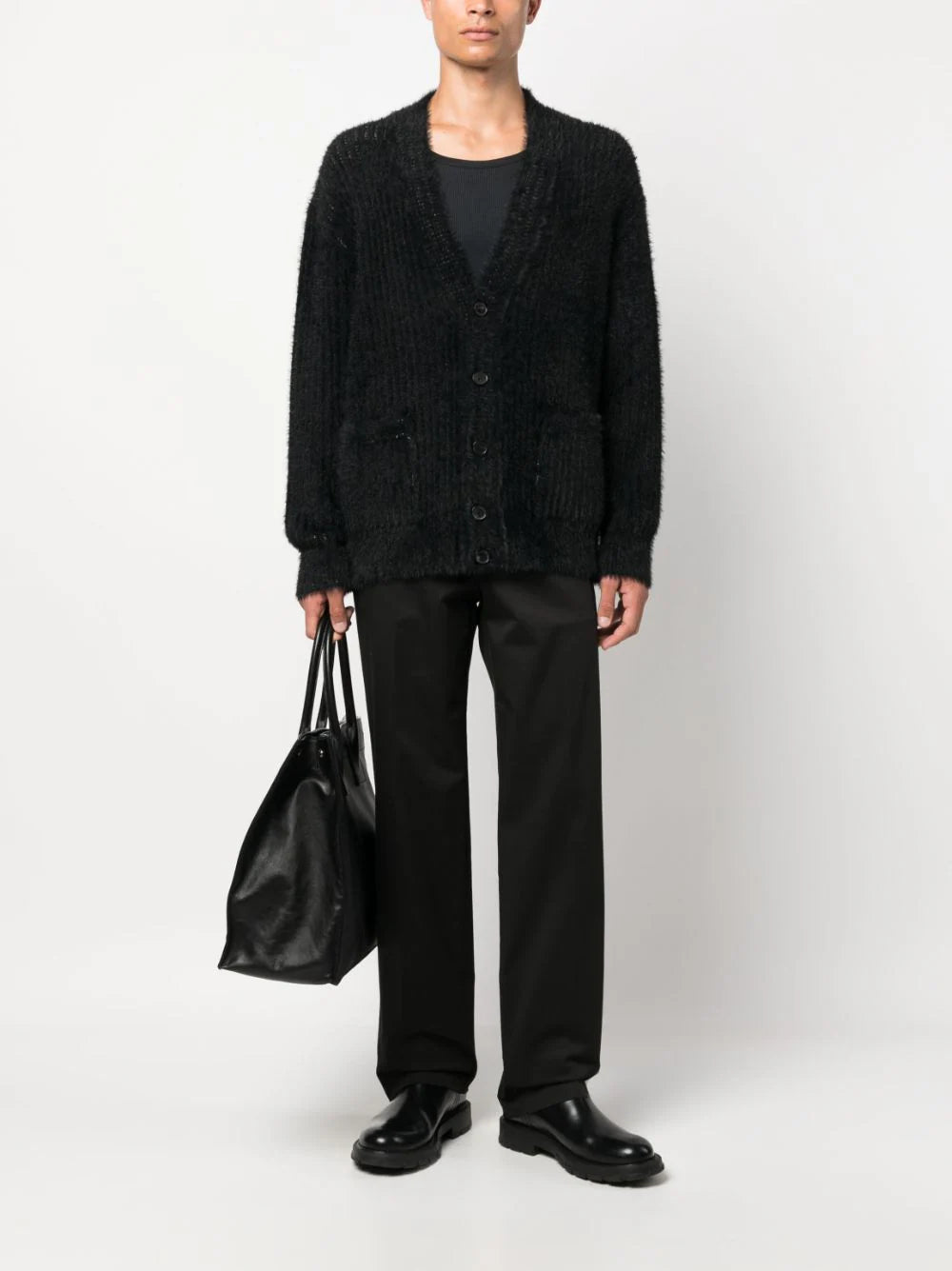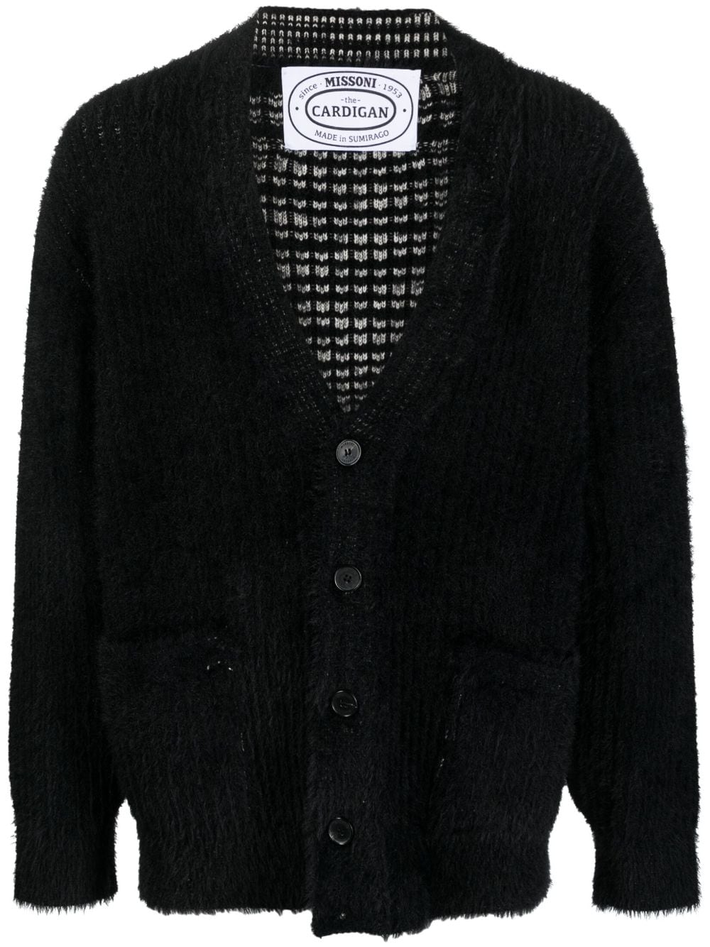 brushed V-neck cardigan from MISSONI featuring black, plunging V-neck, brushed effect, front button fastening, two front patch pockets, long sleeves, ribbed cuffs and hem and straight hem. The item you receive may differ slightly from the item photographed. This is due to the artisanal nature with which all Missoni products are constructed..
