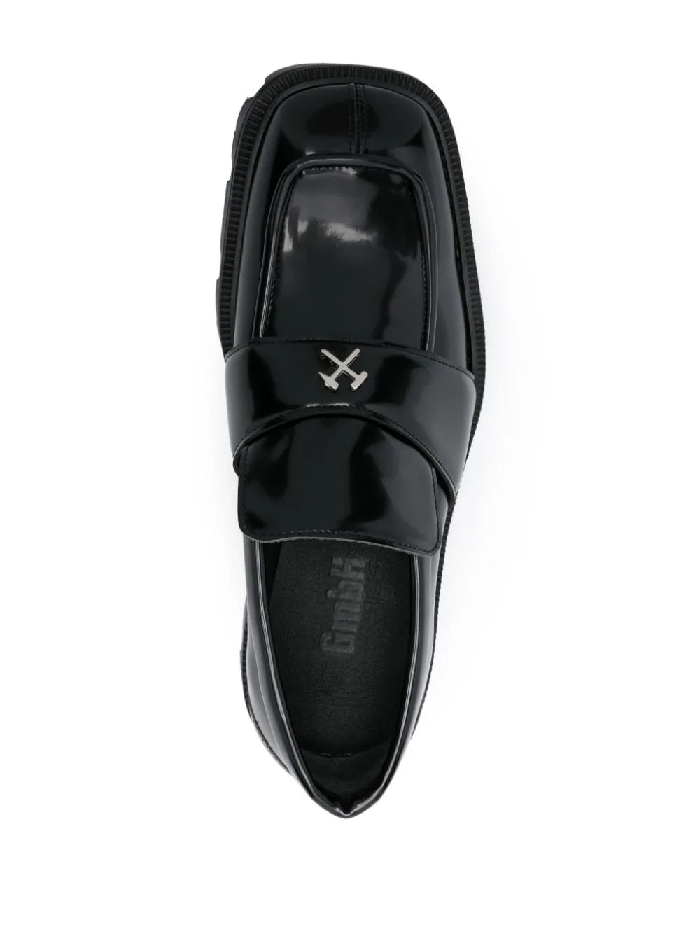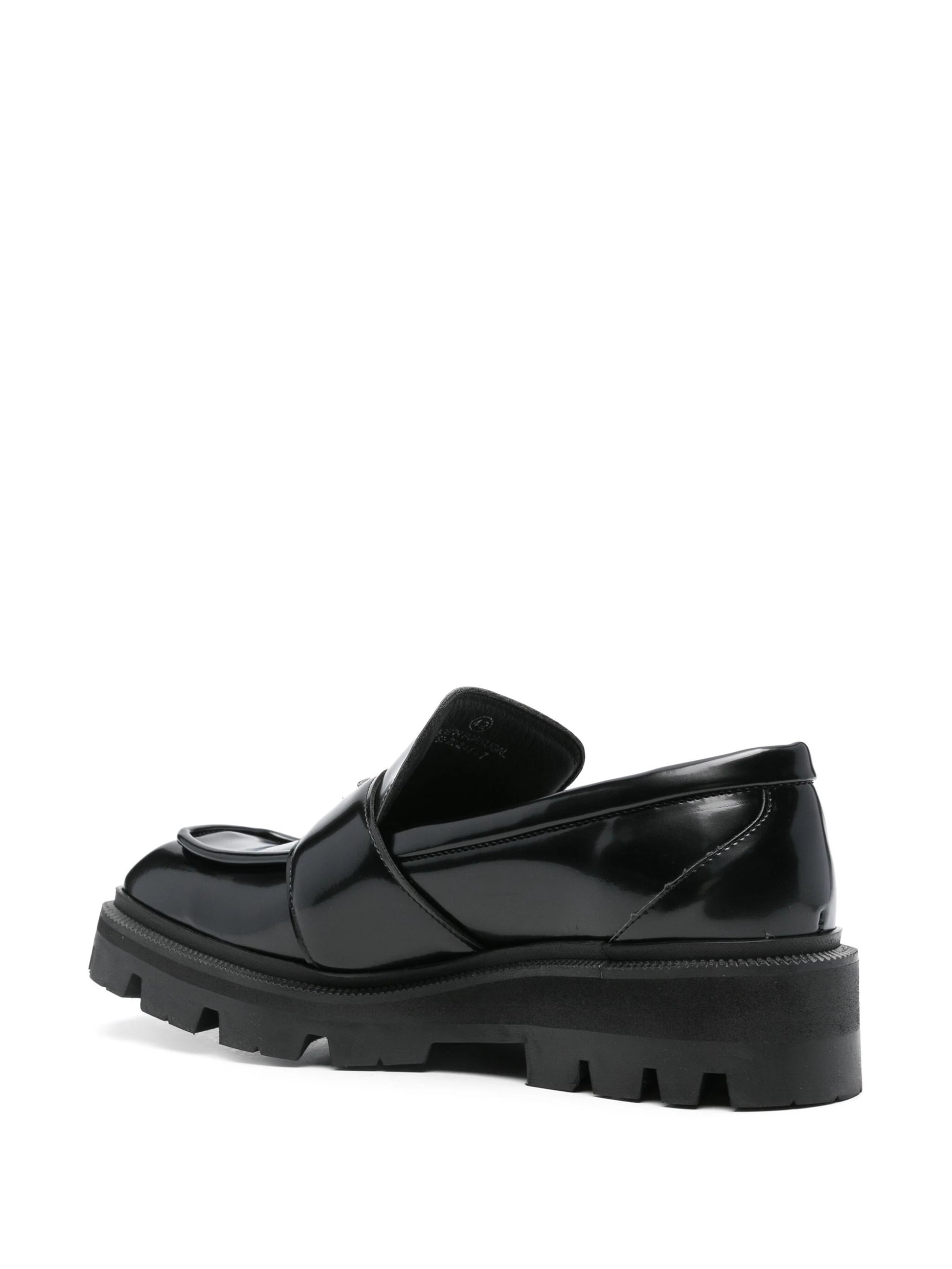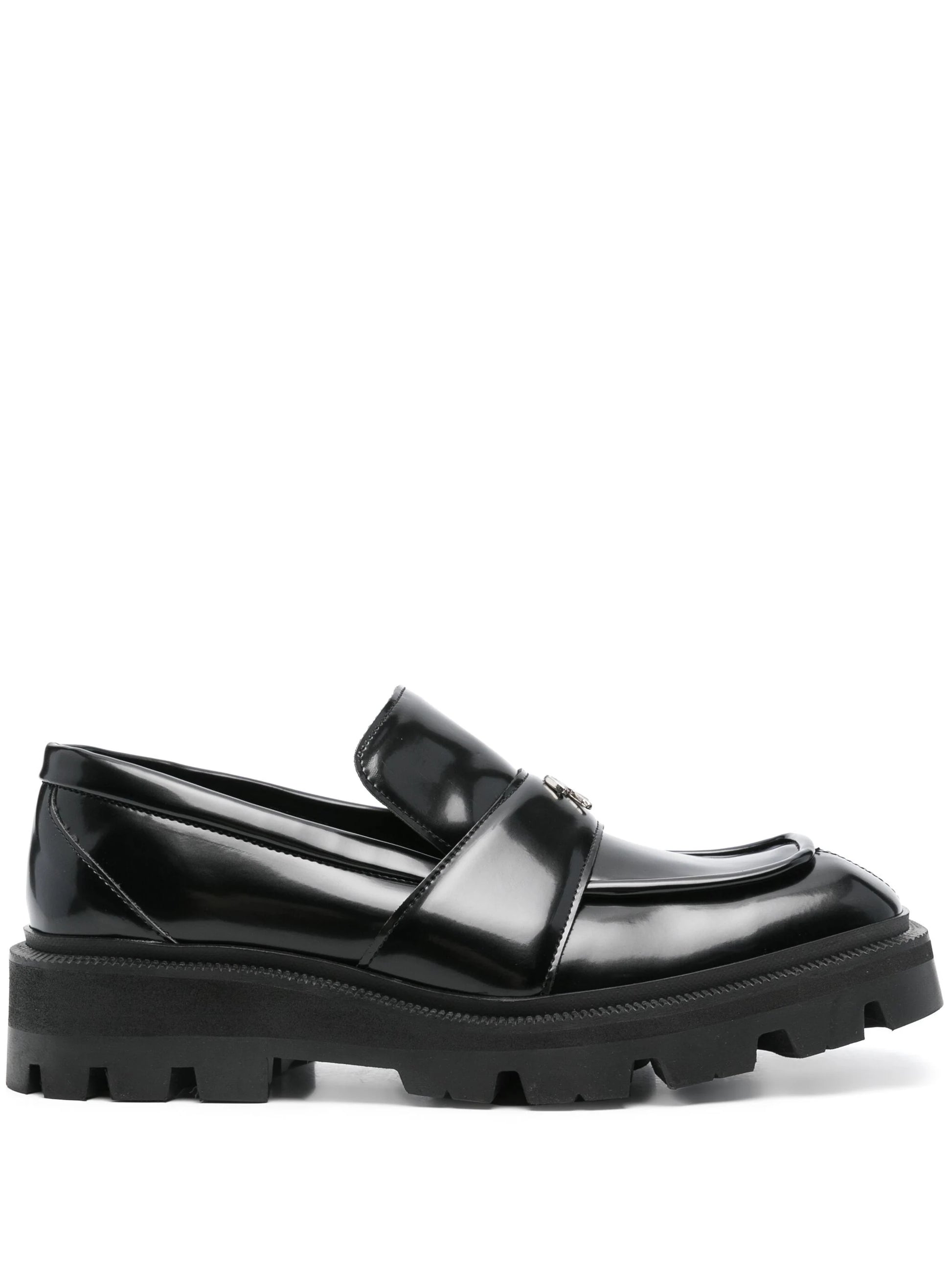 black artificial leather polished effect slip-on style logo plaque to the front square toe branded insole rubber lug sole