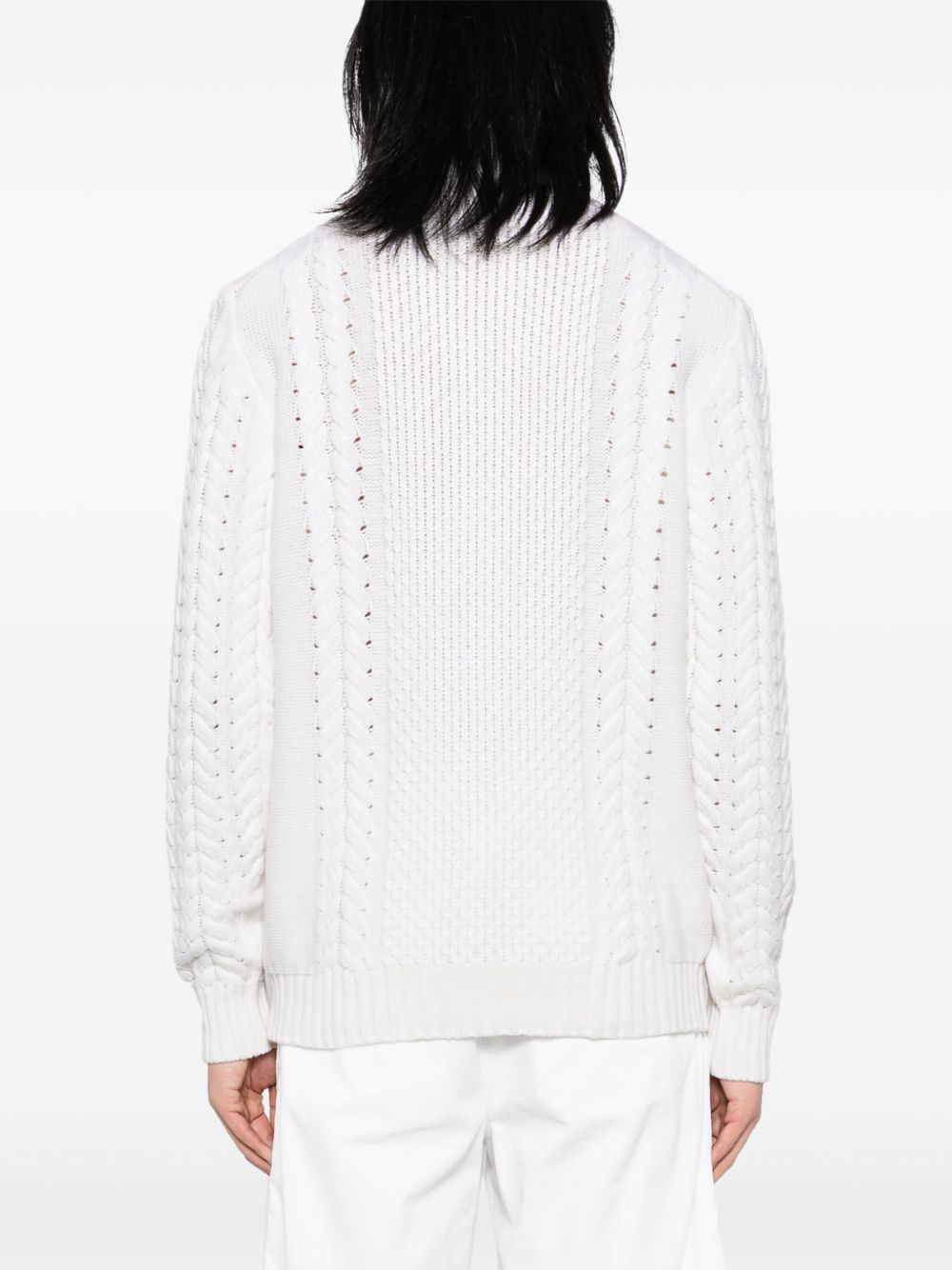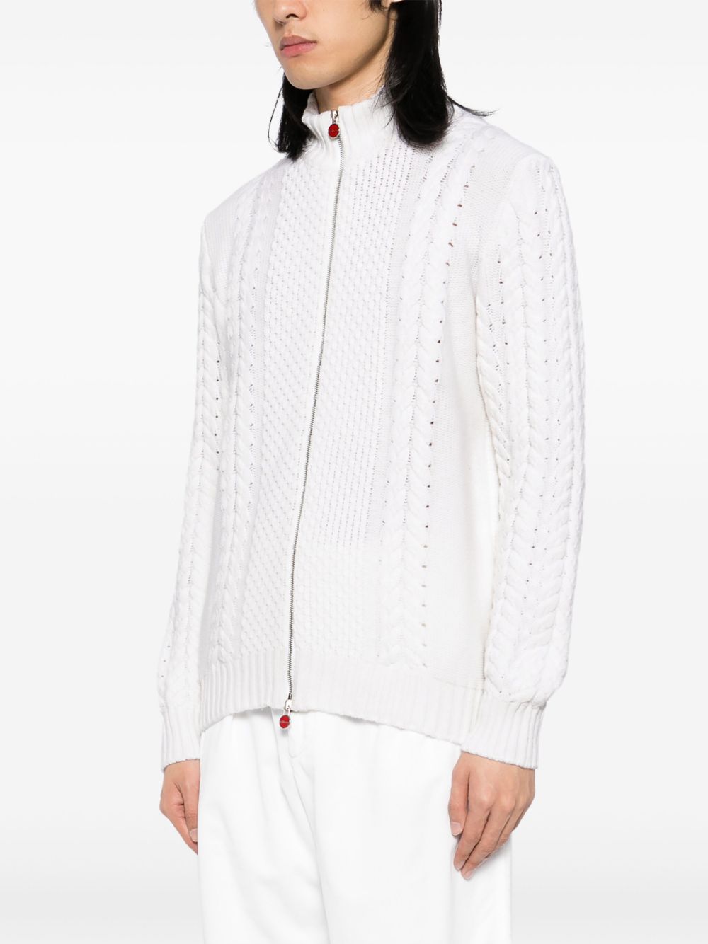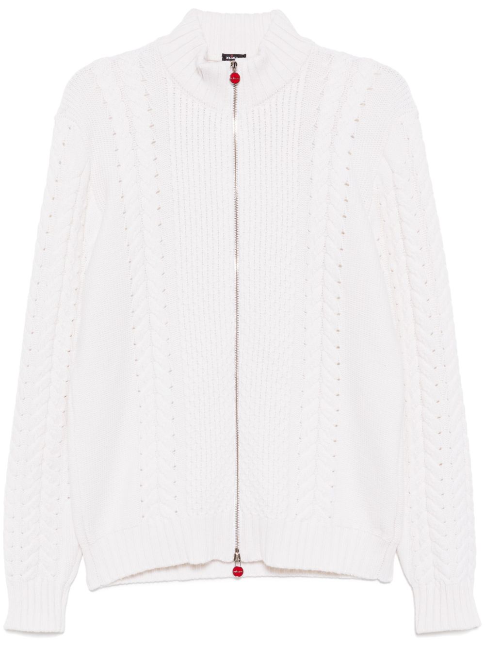 Expertly crafted with luxurious cashmere, this cream white cardigan boasts a classic cable knit design and a cozy funnel neck. The front two-way zip fastening and ribbed cuffs and hem offer both style and functionality, making it the perfect addition to any wardrobe. Stay warm and stylish in this timeless piece.