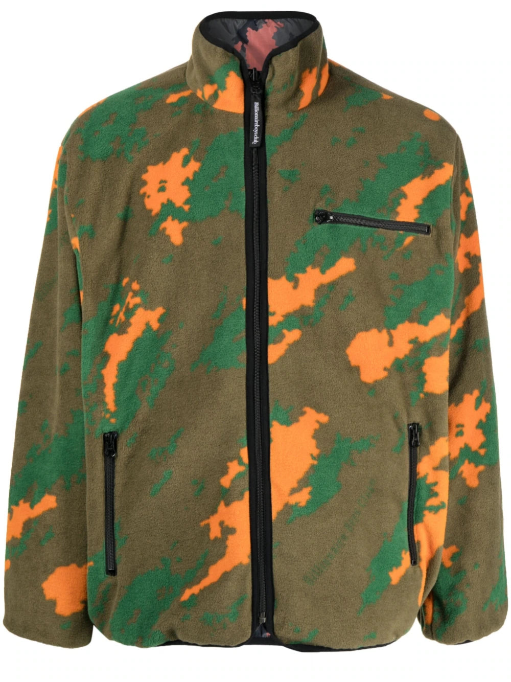 camouflage-pattern reversible jacket from Billionaire Boys Club featuring green, grey, multicolour, reversible, fleece texture, camouflage pattern, logo patch at the sleeve, mock neck, front zip fastening, front zip fastening pockets, long sleeves and elasticated cuffs.